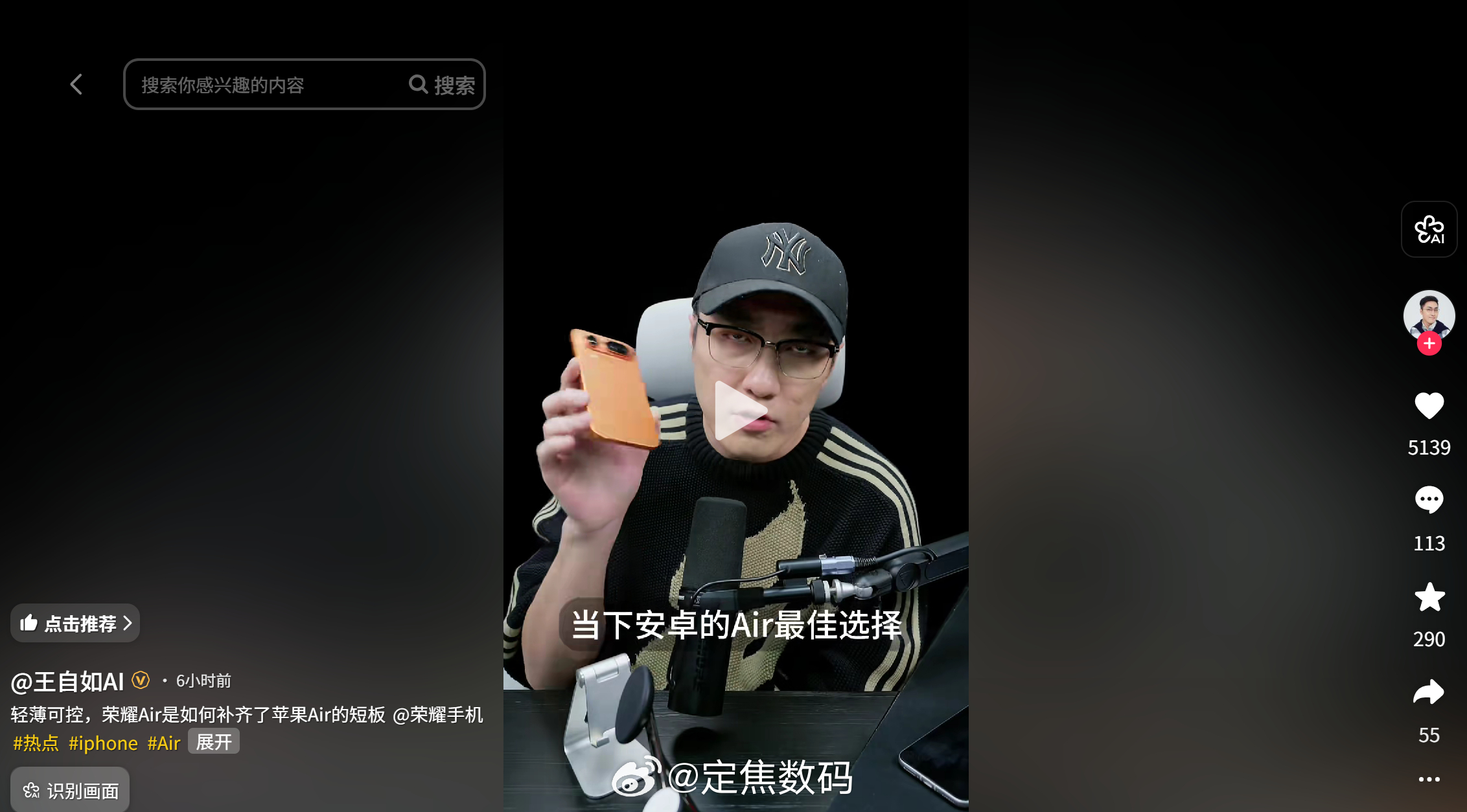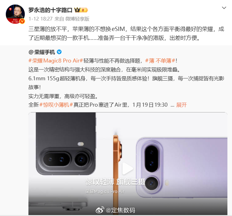 荣耀Air这几天的热度很高,从王自如质疑安卓做不好Air,结果上手荣耀Magic8 Pro Air 后直接打脸,直播里王自如说荣耀Air补齐iPhoneAir短板。对比苹果Air产品力更胜一筹。此前老罗也表示,这款产品各方面平衡得不错。两位老冤家意外地在荣耀Air上同频了。这款新机比苹果Air更轻,塞进了3个摄像头,影像属于Pro级,双扬和实体SIM卡槽也解决了iPhone Air配置阉割的遗憾。