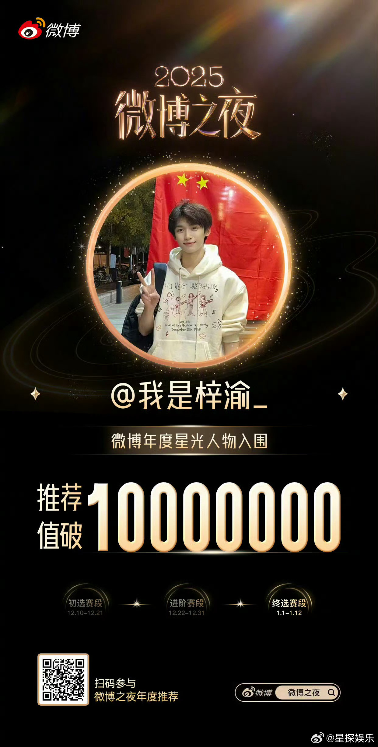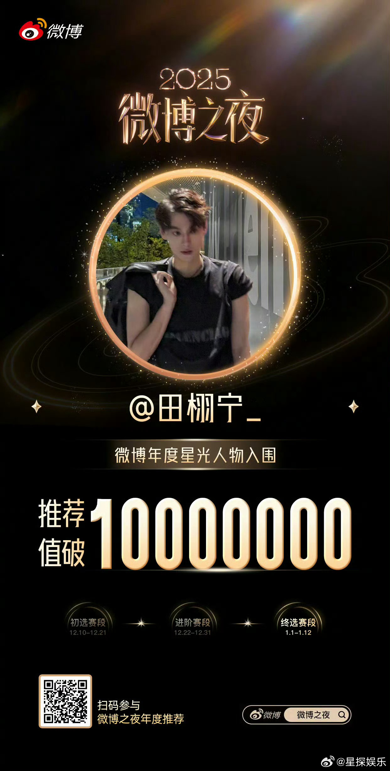 梓渝田栩宁肖战获年度星光人物星光璀璨,实至名归!恭喜梓渝,田栩宁,肖战荣获2026微博之夜“年度星光人物”!一位是新生代断层领跑的超级偶像,一位是舞台魅力席卷全球的焦点,一位是凭现象级作品深入人心的实力演员。三种闪耀,共筑今晚的荣耀星空,未来更加可期。