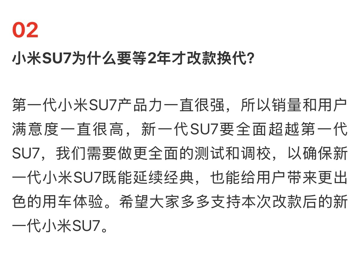 小米汽车回应SU7为何等2年才改款换代慢对老车主最好了,比那些一年换三代的车企好