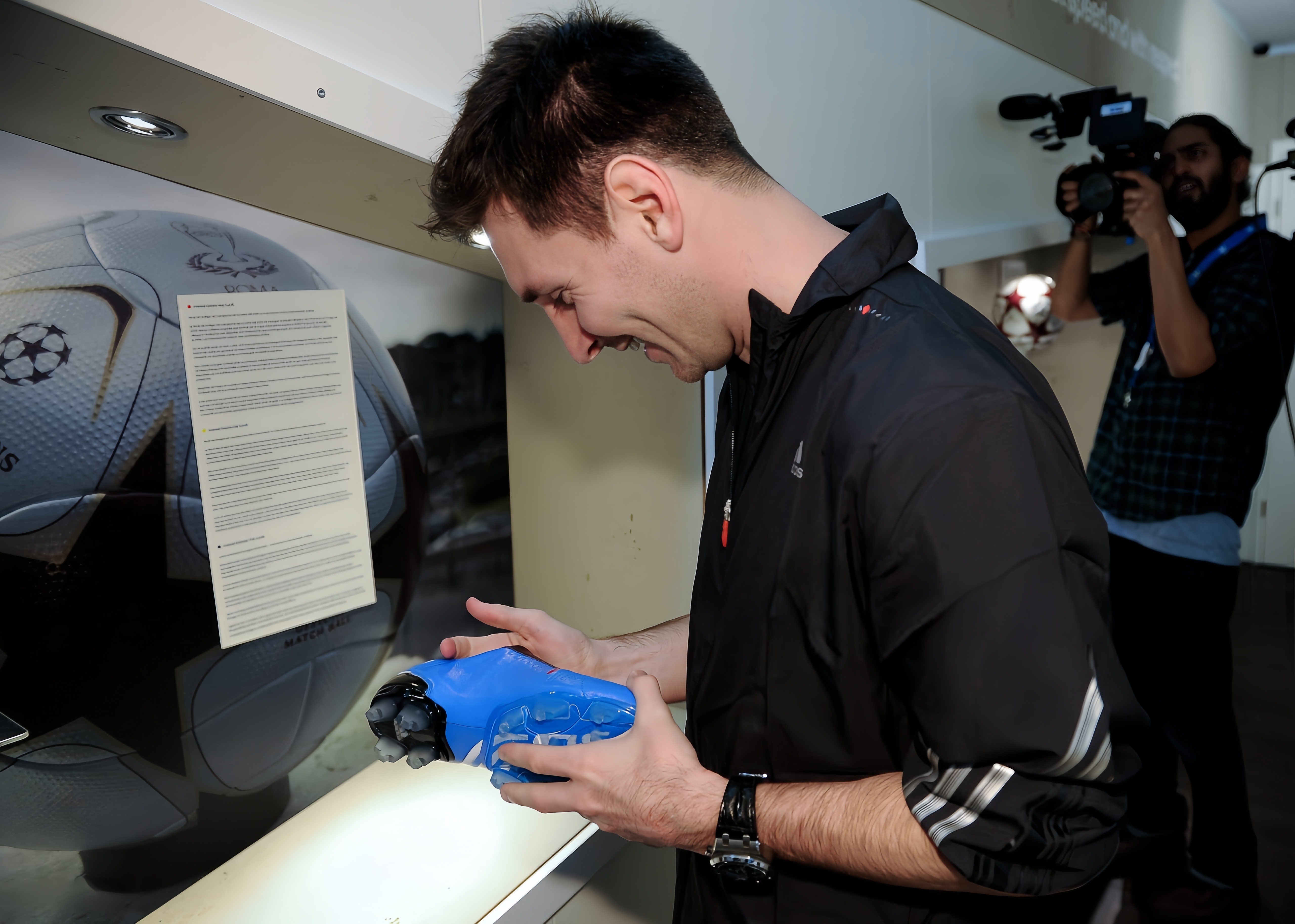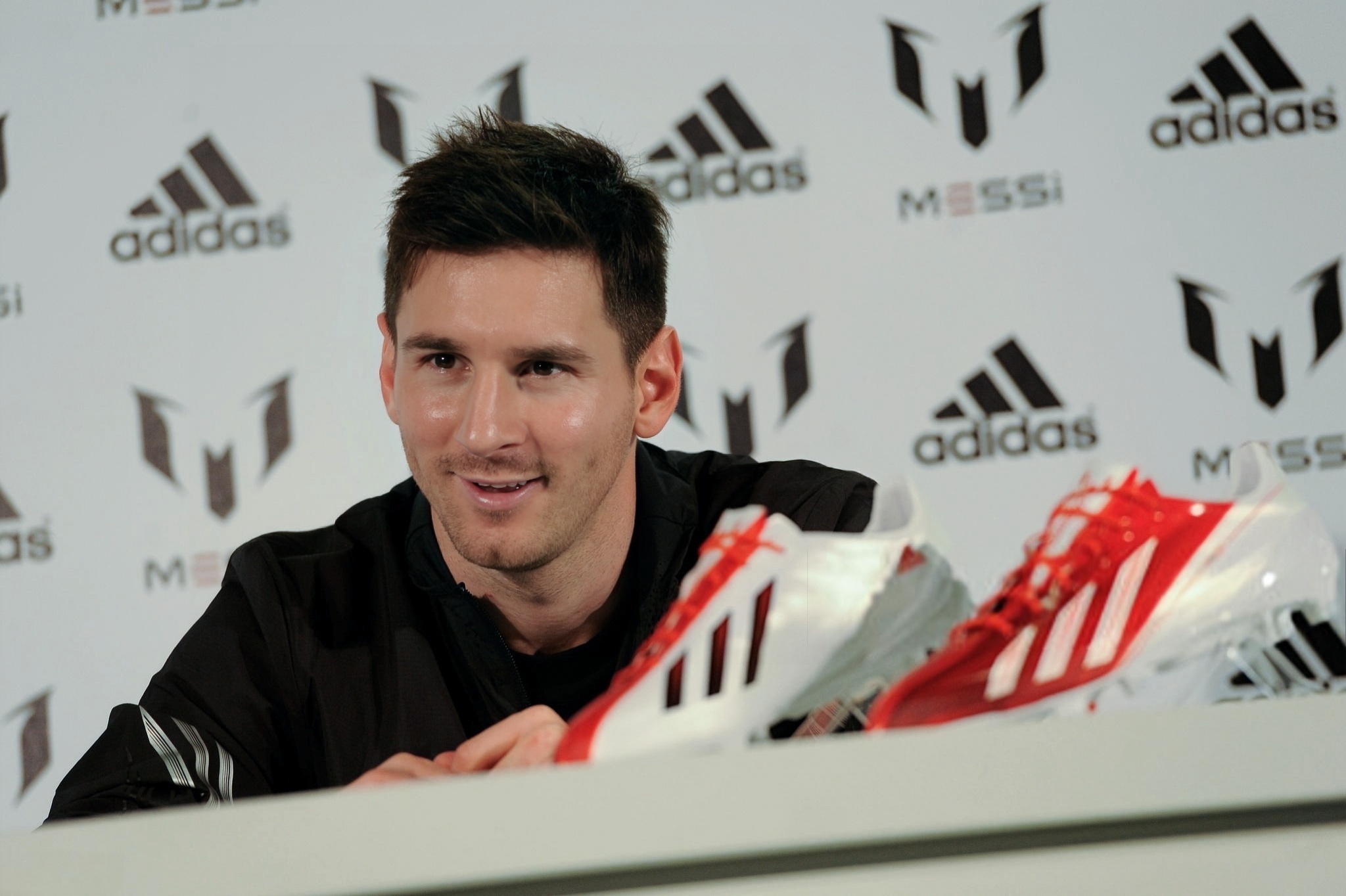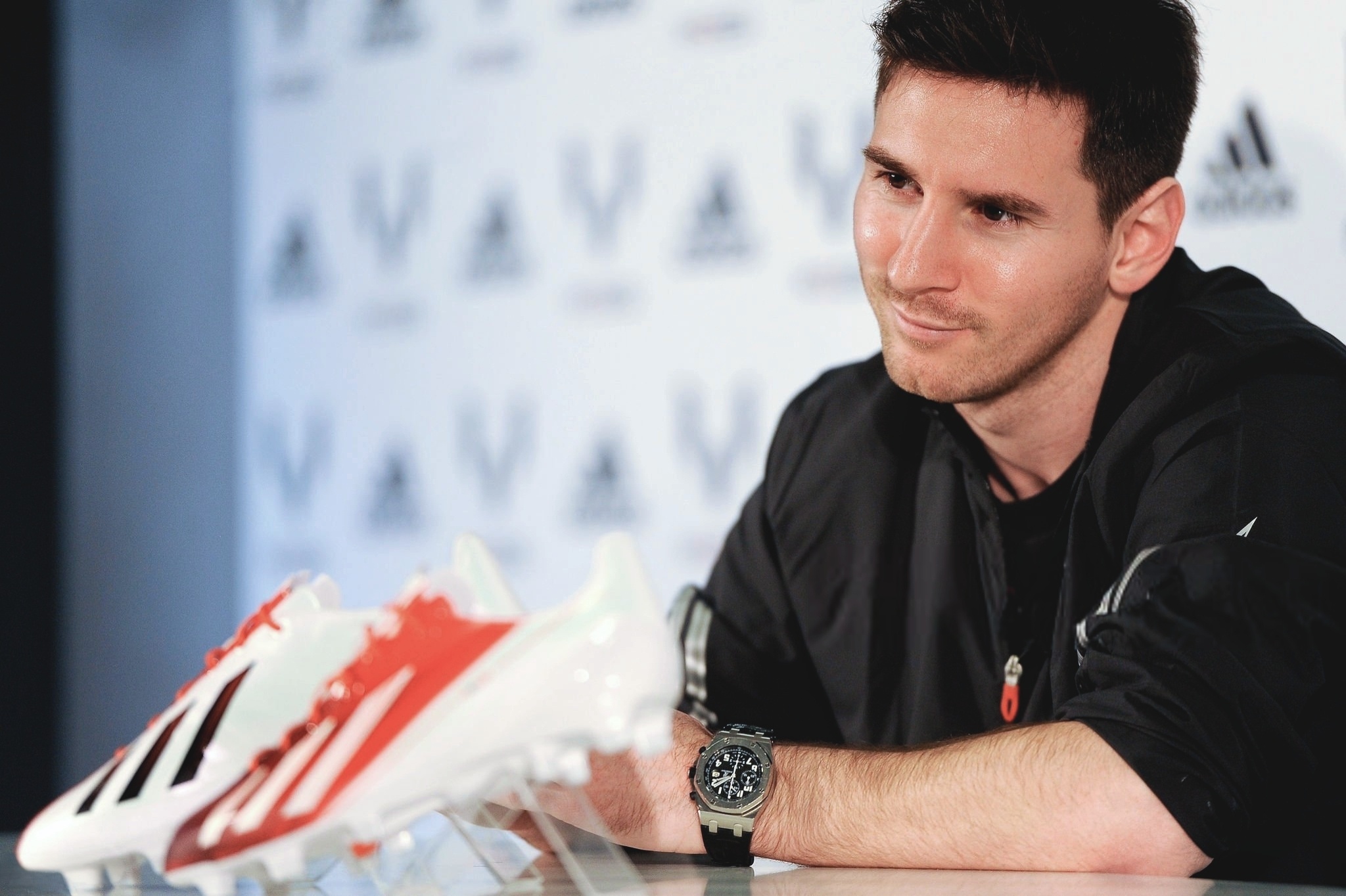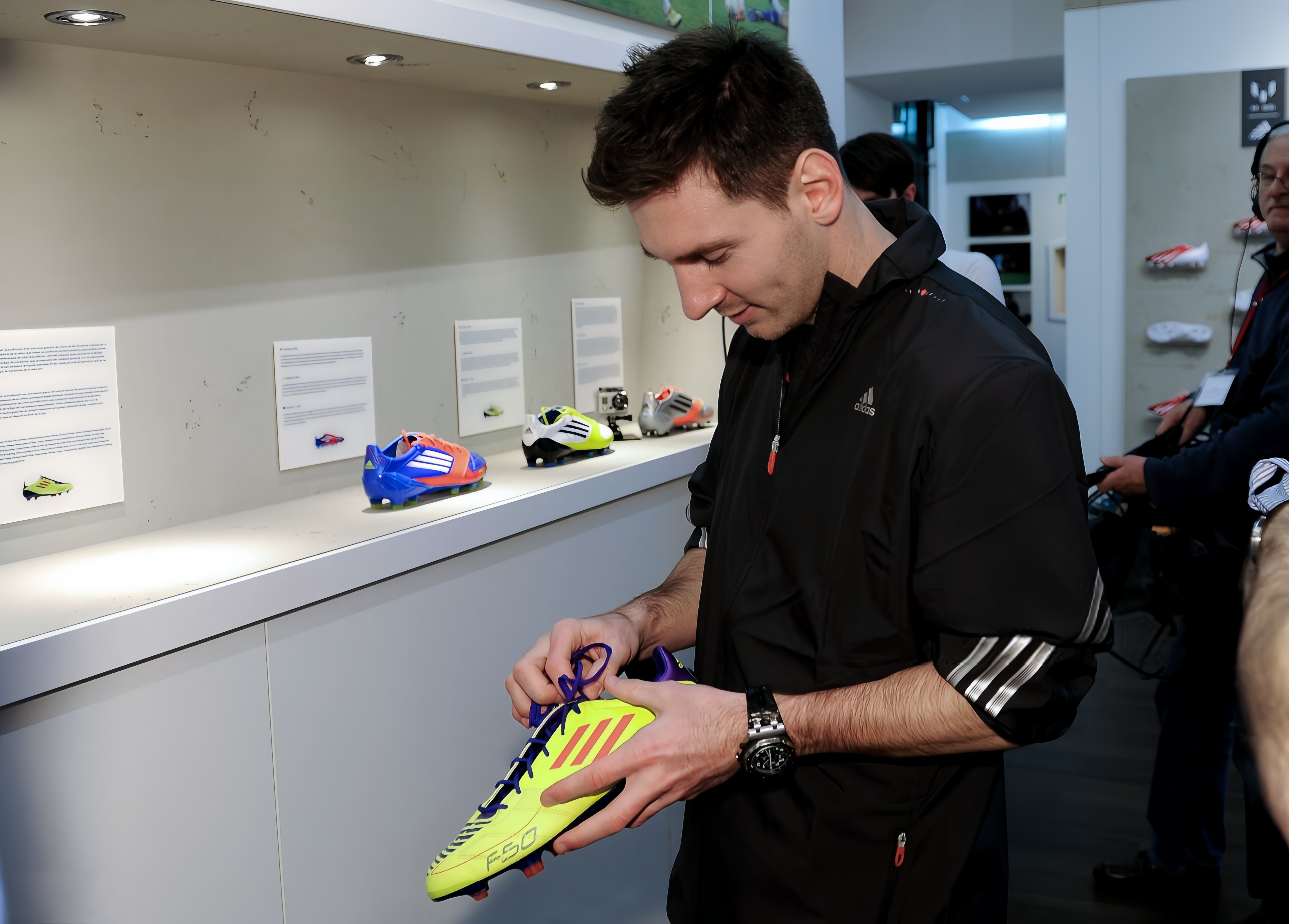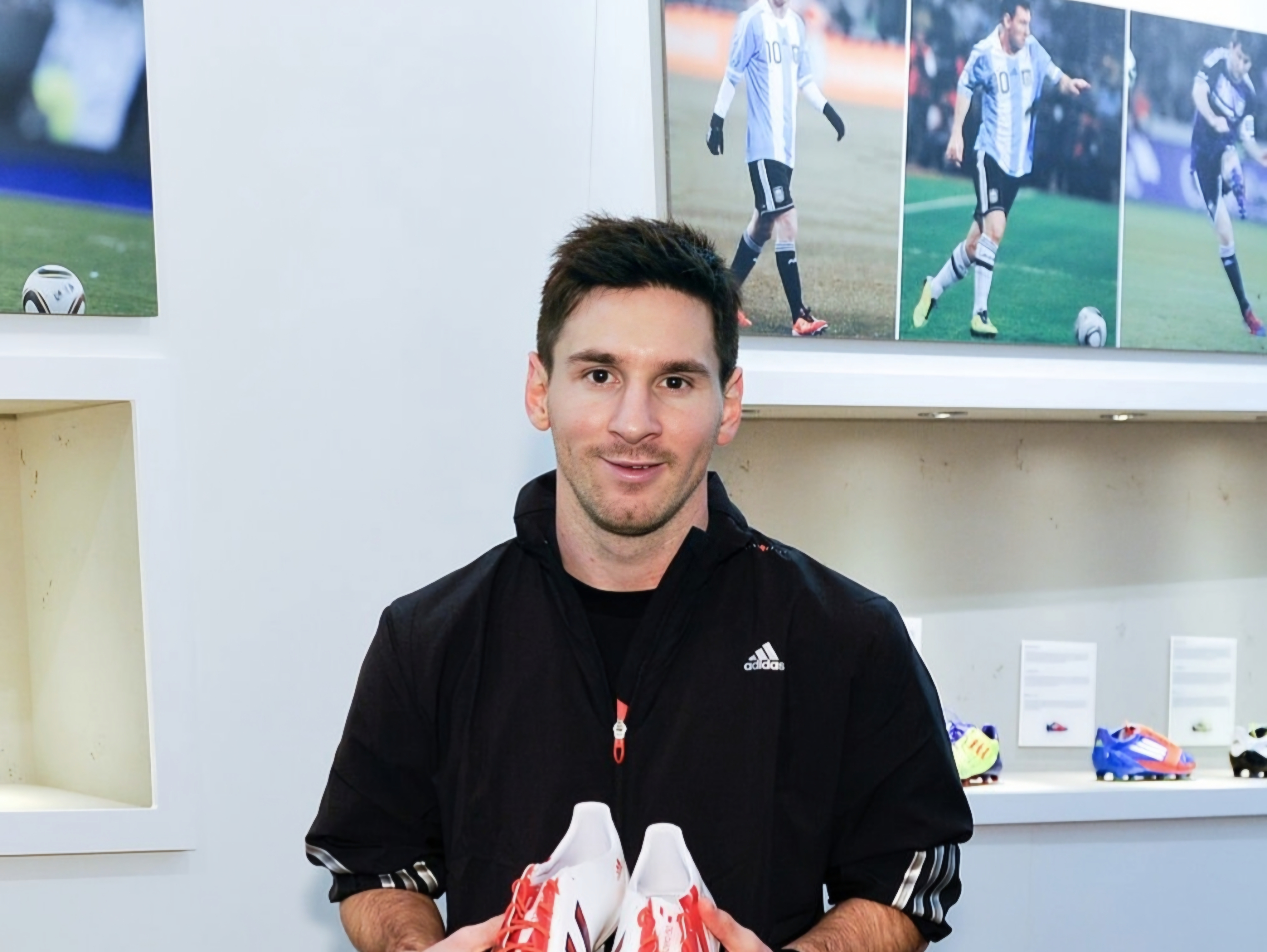 20130306|西班牙巴塞罗那——莱昂内尔·梅西在参观位于巴塞罗那的全新 adidas Messi Gallery 时,获赠并接收了为他呈上的 adizero f50 Messi 足球鞋。