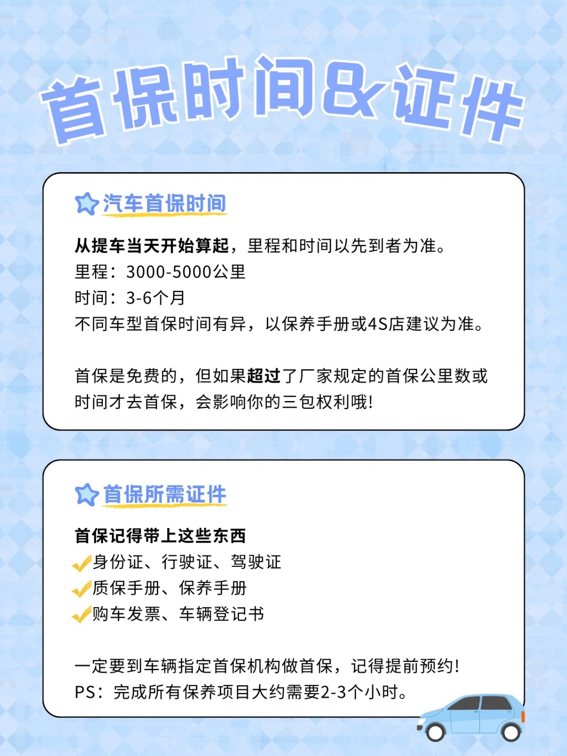 汽车首保全攻略|项目&时间&证件看这篇!汽车首保就是买新车后的第一次保养,很重要!10秒就能看懂的首保全攻略来啦~⏰首保时间按保养手册来!一般是行驶3000-5000公里或者3-6个月,里程和时间以先到者为准。🎯首保目的确保新车正常运行,及时发现和处理存在的问题,提高性能,延长汽车的使用寿命。🔧保养项目换机油机滤、汽油滤清器、空气滤清器;检查冷却液、转向助力油等各种油液位置;检查车灯、轮胎、刹车系统的情况;检查底盘是否损伤等等。一定要在规定时间内去!逾期就得自费汽车大v聊车