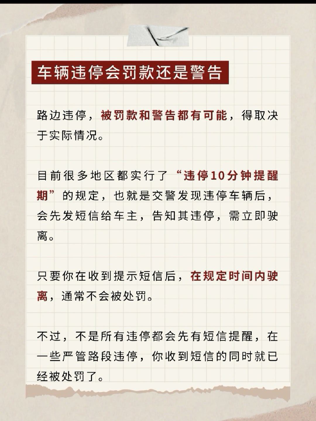 路边临时停车时候太长,被交警抓到了会算违停,但并不一定会被罚款~现在大部分地区都有「违停10分钟提醒期」,交警发现违停后,会先给车主发信息警告一下,只要在规定时间(5-10min)内开走,完全不会被处罚!但不是所有违停都有提醒,下面这5种情况一停就挨罚,别踩雷!1.快速路、严管路段停车2.停在人行横道、网状线上3.违停导致堵车4.违停引发交通事故5.同一天被提醒过,还敢再违停收到罚单后如果没异议,尽快上交管12123缴纳罚款哦提醒宝子们!停车前先看路边标志,别为了省几块钱,反被罚好几百汽车大v聊车