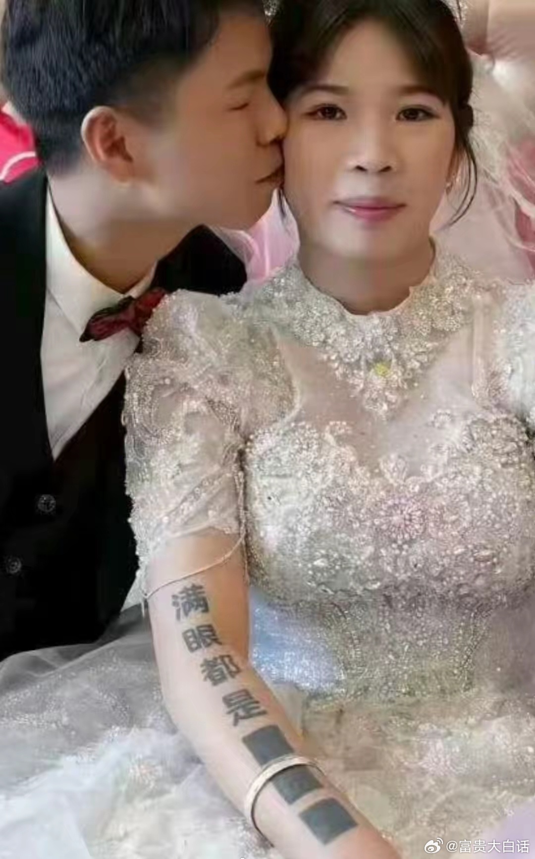 看看新娘手臂的纹身,太尴尬了吧,只能说新郎大度。女孩们一定不要在显眼的位置纹前男