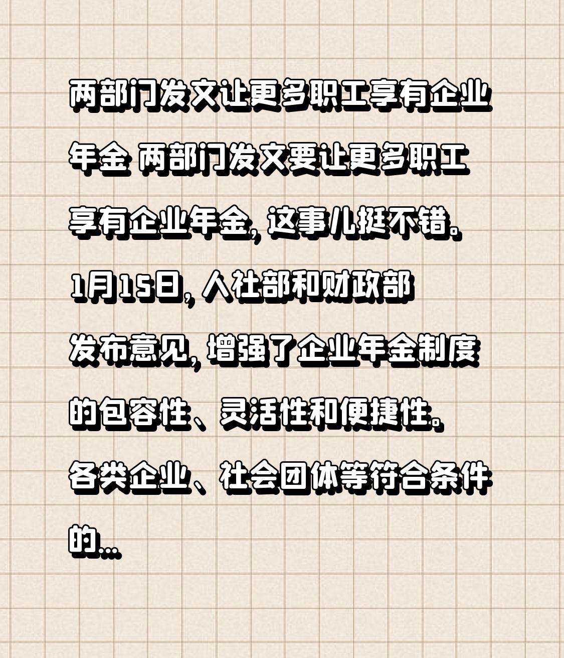 两部门发文让更多职工享有企业年金 两部门发文要让更多职工享有企业年金,这事儿挺不错。1月15日,人社部和财政部发布意见,增强了企业年金制度的包容性、灵活性和便捷性。各类企业、社会团体等符合条件的用人单位及其职工都能按规定建立。缴费上,可在限额内灵活选比例或额度,经济负担有限的能先低后高。建立方式多样,可建单一计划,也能参加集合计划,还探索为中小微企业提供简易程序。此外,会选部分园区试点,加快建设信息平台和数据库,方便职工查询等,希望能让更多人受益。