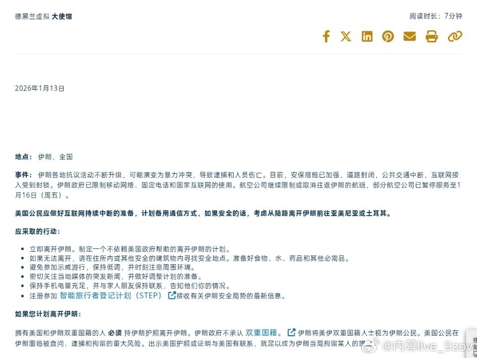 美国驻伊朗虚拟大使馆:美国公民应立即离开伊朗。制定一个不依赖美国政府帮助的离开伊