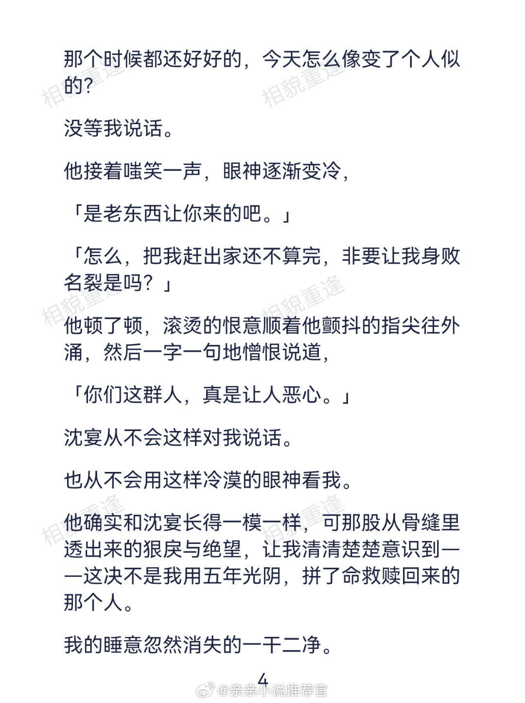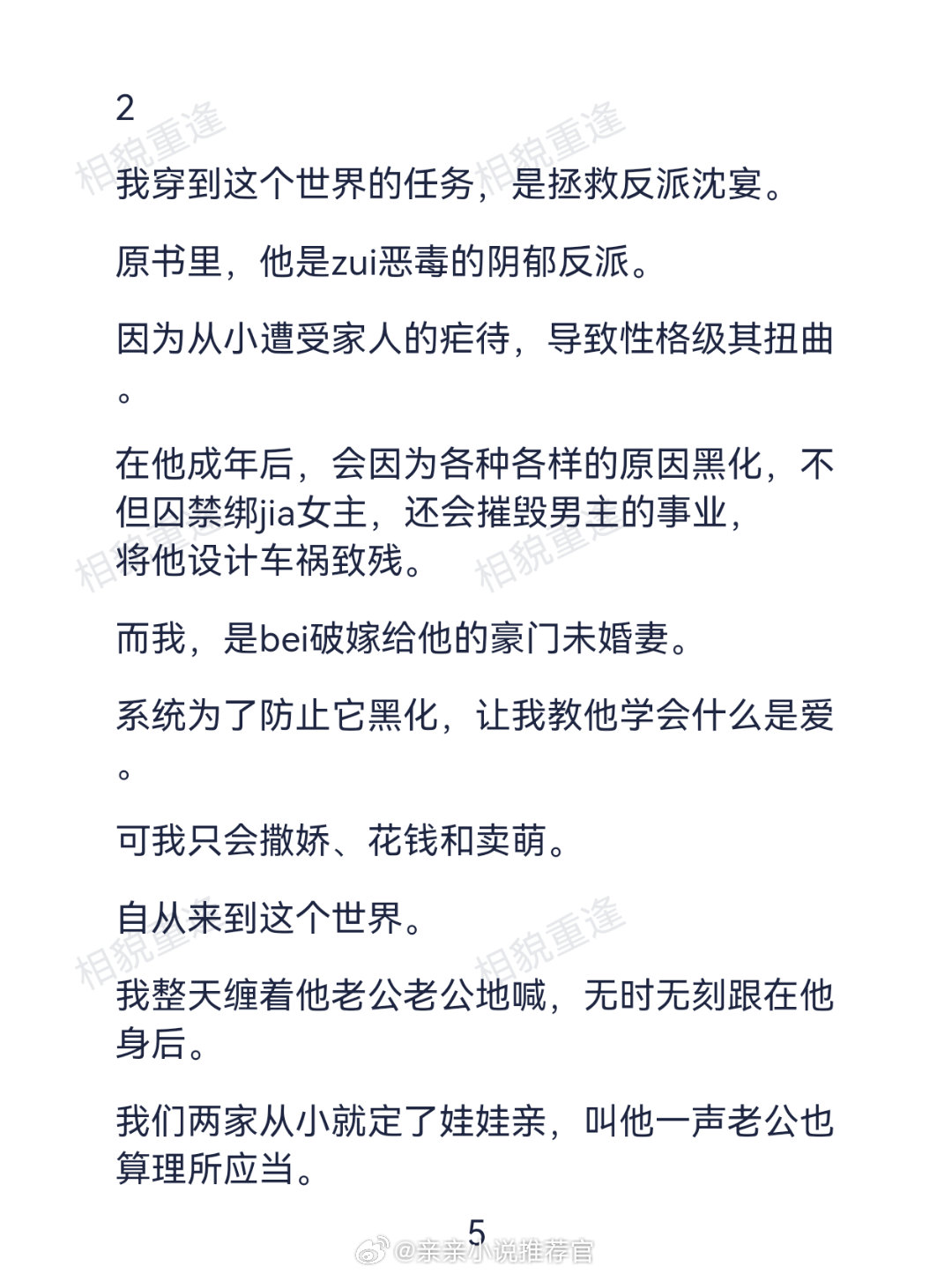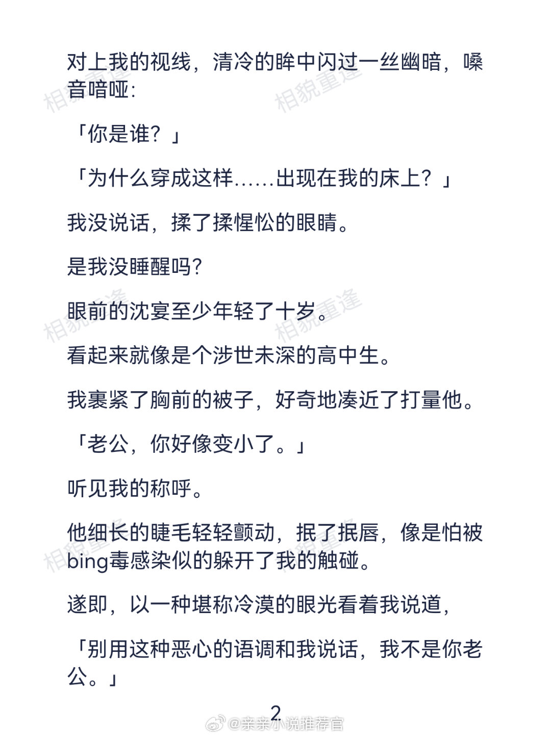言情小说《相貌重逢》现代言情小说脑洞系统文一觉醒来,老公突然变回了十七岁的模样。他不信自己结了婚,红着脸咬牙道:「我就是死,也不会娶你这样…低俗的女人。」可他话还没说完,门外和他长得一模一样的男人阴沉着脸走进来。我软软开口:「老公,抱。」「都说了我不是你老公!」「她喊的是我。」男人阴沉着脸将我抱起,低哑嗓音裹着不容置疑的气场和藏不住的怒火。「谁叫你了?自作多情。」