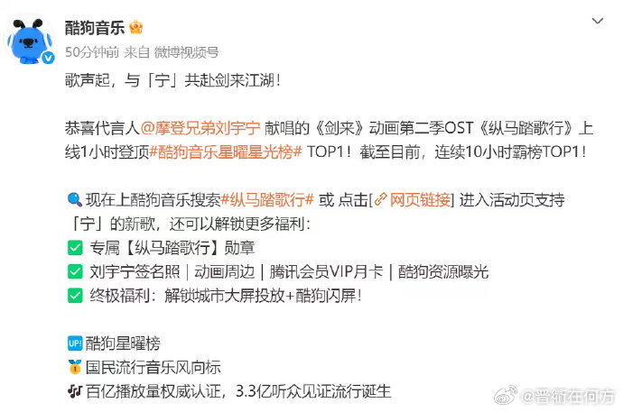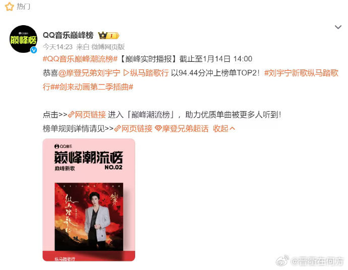 【太强了!刘宇宁新歌三榜高分领跑】刘宇宁新歌连续10小时霸榜 1月14日,为《剑来》动画第二季献唱的插曲《纵马踏歌行》正式上线,新歌一经发布便斩获亮眼成绩:酷狗音乐平台,歌曲上线1小时就登顶星曜星光榜TOP1,且持续霸榜该榜单榜首长达10小时;据腾讯音乐由你榜显示,《纵马踏歌行》目前周榜实时排名TOP10,实时综合得分90.29,日榜实时排名TOP4,实时综合得分95.17;QQ音乐巅峰榜,新歌以94.44分的优异成绩冲上榜单TOP2。据悉,《纵马踏歌行》是刘宇宁2026年第一首OST,网友听完直呼 “这才是武侠OST的正确打开方式”!