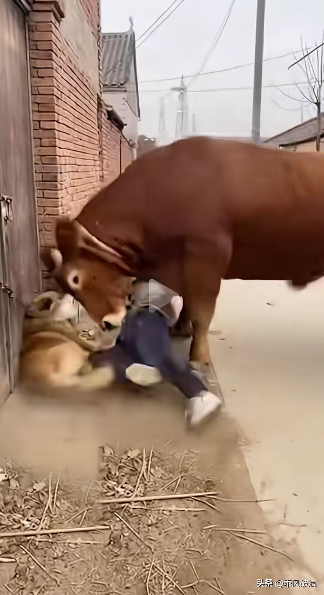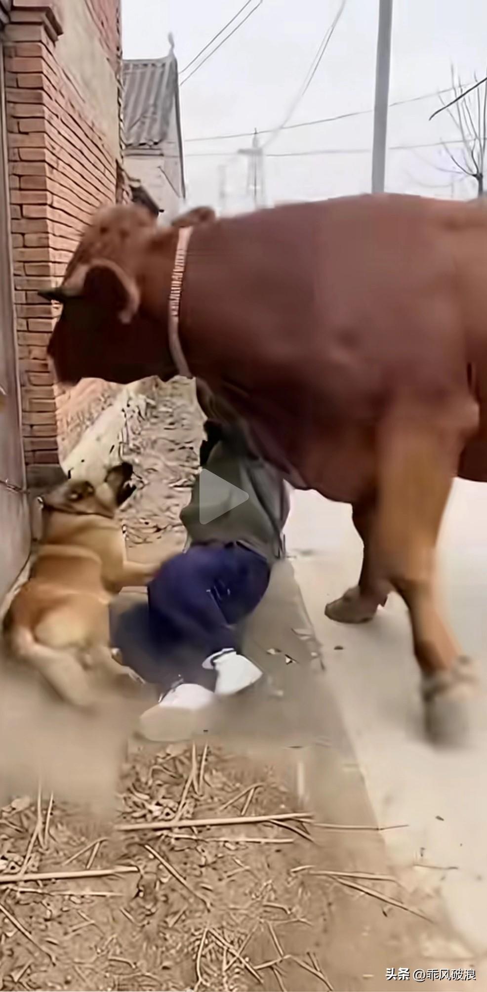 男子手持木棍,对着一只拴在门口看家的狗不断抽打,狗狗疼得惨叫连连。旁边一头颇具灵性的黄牛看不下去,用头将男子顶翻在地,接着又用牛角去撞他。男子赶忙从地上爬起来,一瘸一拐地溜走了,大黄狗因此得到了保护。 无缘无故抽打看门狗