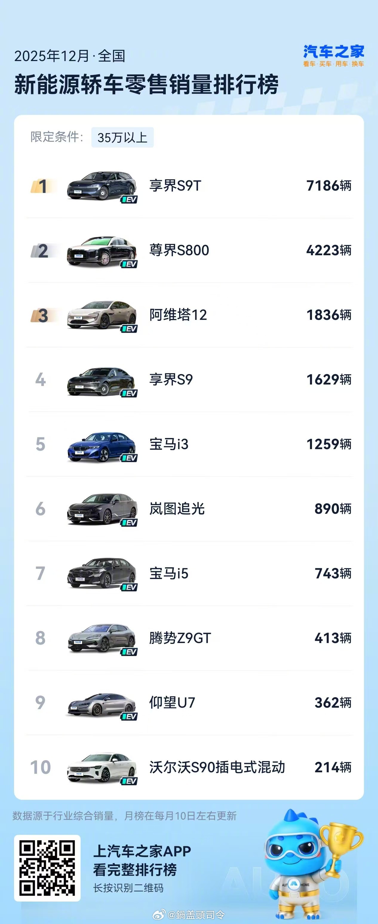 12月汽车品牌销量公布,享界轿旅双子星销量再创新高。在35万以上中大型轿车中,#享界S9T# 与BBA形成了新的SBBA格局,连续3个月销量位列TOP4,#享界S9#的市场表现也稳步提升。#中国汽车产销量再创历史新高#