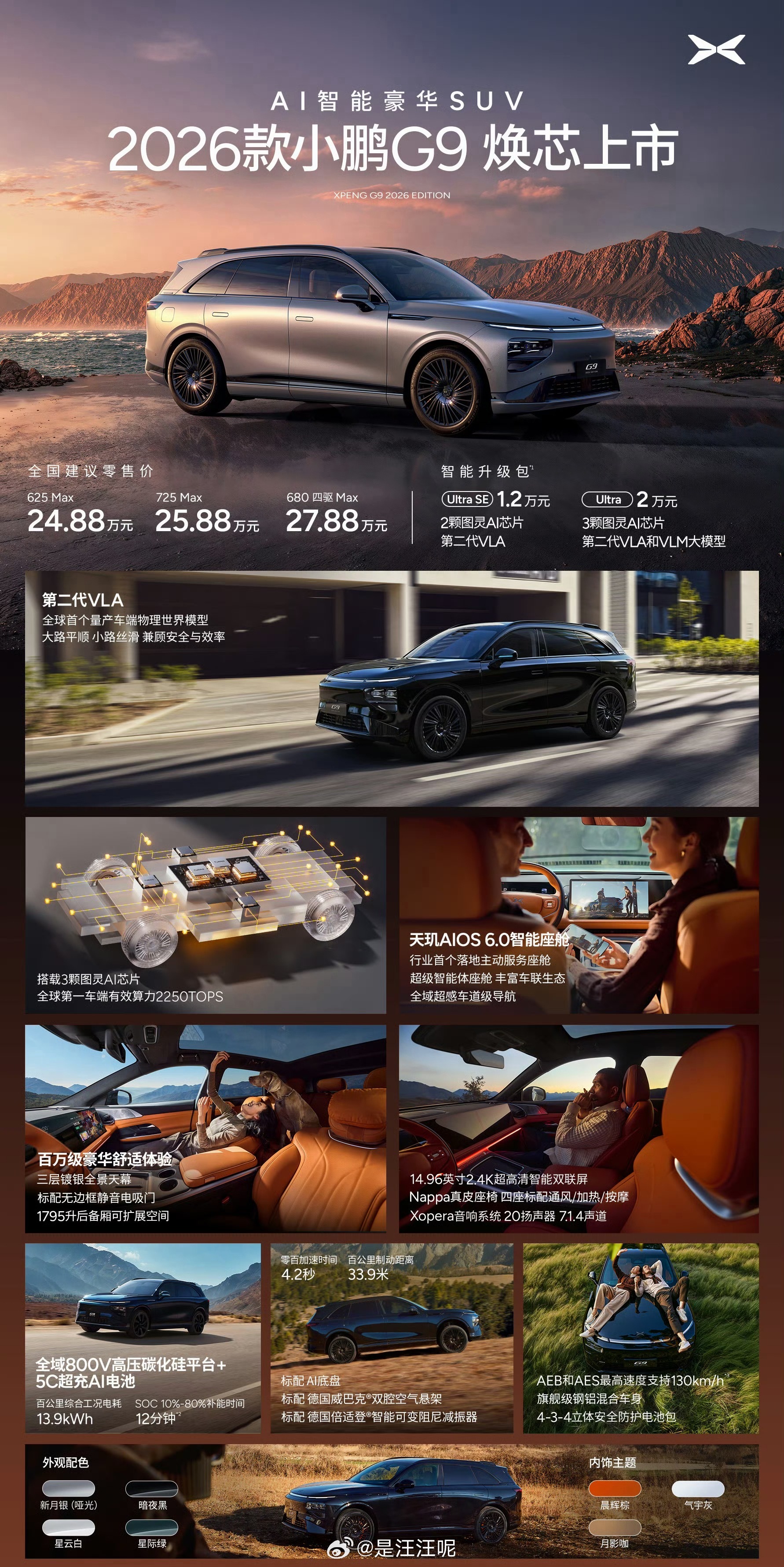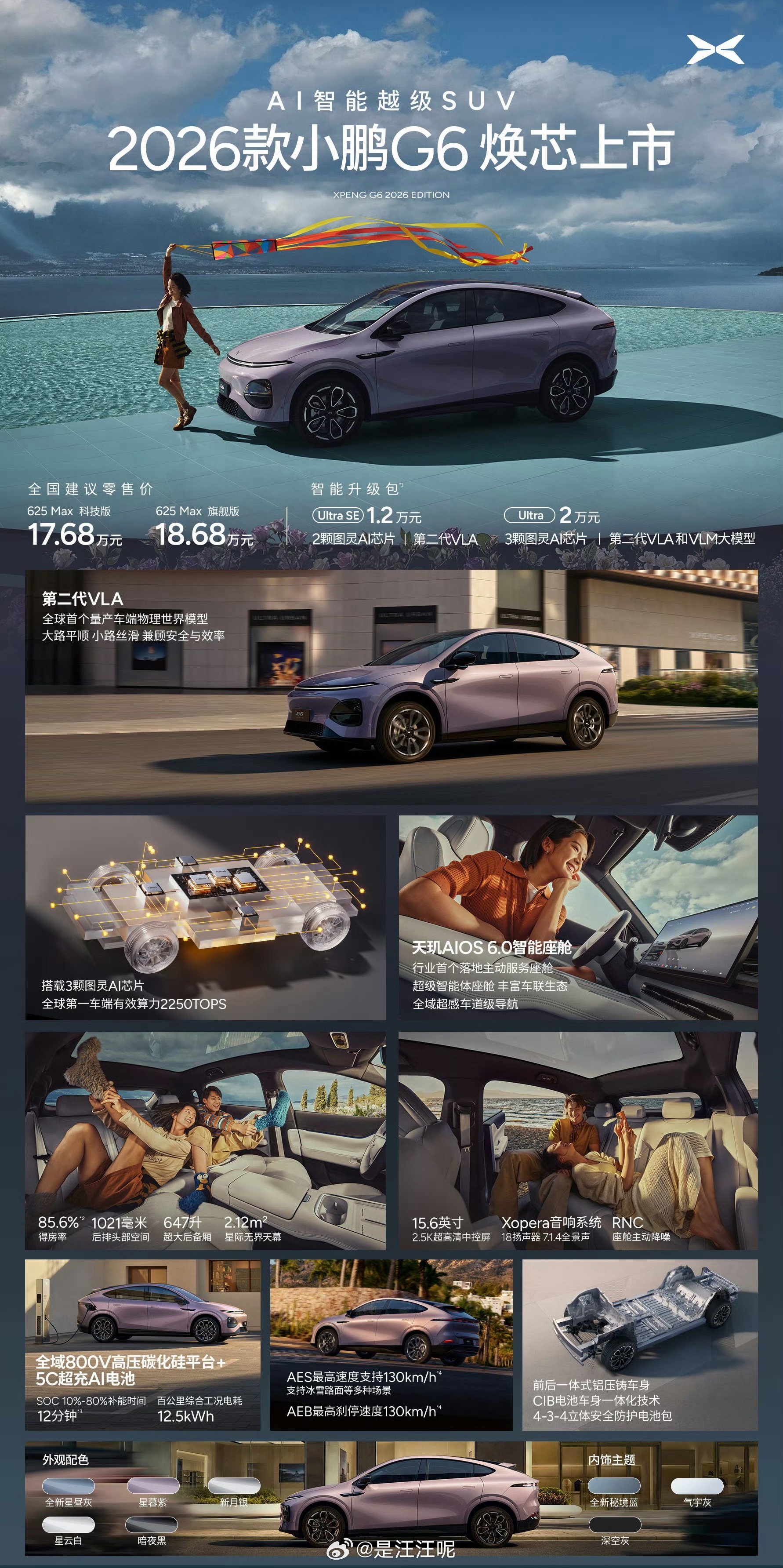 小鹏2026全球新品发布会直接炸场!17.68万起的定价,把顶级AI智驾、超长续航狠狠下放主流市场,科技平权这波真的玩到极致!四款新车覆盖轿车SUV、纯电增程双线,每款都戳中用车痛点~✅ 2026款G6(17.68万起):六边形战士实锤!全系图灵AI芯片+750-2250TOPS三档算力,800V高压平台+5C超充12分钟快充10%-80%,12.5kWh/100km低电耗+85.6%高得房率,新增RNC主动降噪+18扬声器音响,静谧性拉满,年轻家庭闭眼冲!✅ P7+(18.68万起):全球36国同步发!2000兆帕超高强度笼式车身+16000T一体压铸工艺,冰雪AES主动安全系统应对复杂路况,超级增程版1550km综合续航+430km纯电续航,前后排“双1米”空间+2221L扩展后备箱,Ultra版2250TOPS算力,安全实用双在线!✅ G7超级增程(19.58万起):续航卷王来了!1704km综合续航+430km纯电续航+60L油箱,彻底告别补能焦虑~779L基础后备箱可扩至2237L,38处储物空间+20余项豪华配置,四座标配通风/加热/按摩,母婴级环保材质,家庭出行首选没跑!✅ G9(24.88万起):豪华旗舰天花板!全系标配德国威巴克双腔空气悬架+倍适登智能阻尼减振器,5档高度+3档软硬调节,95%软质内饰+满配女王副驾,全域800V平台补能高效,Ultra版搭第二代VLA L4级智驾(3月推送),百万级体验触手可及!全系还标配天玑AIOS 6.0与3D车道级导航,这配置这价格,2026买车谁能不看小鹏?小鹏新年四车齐发