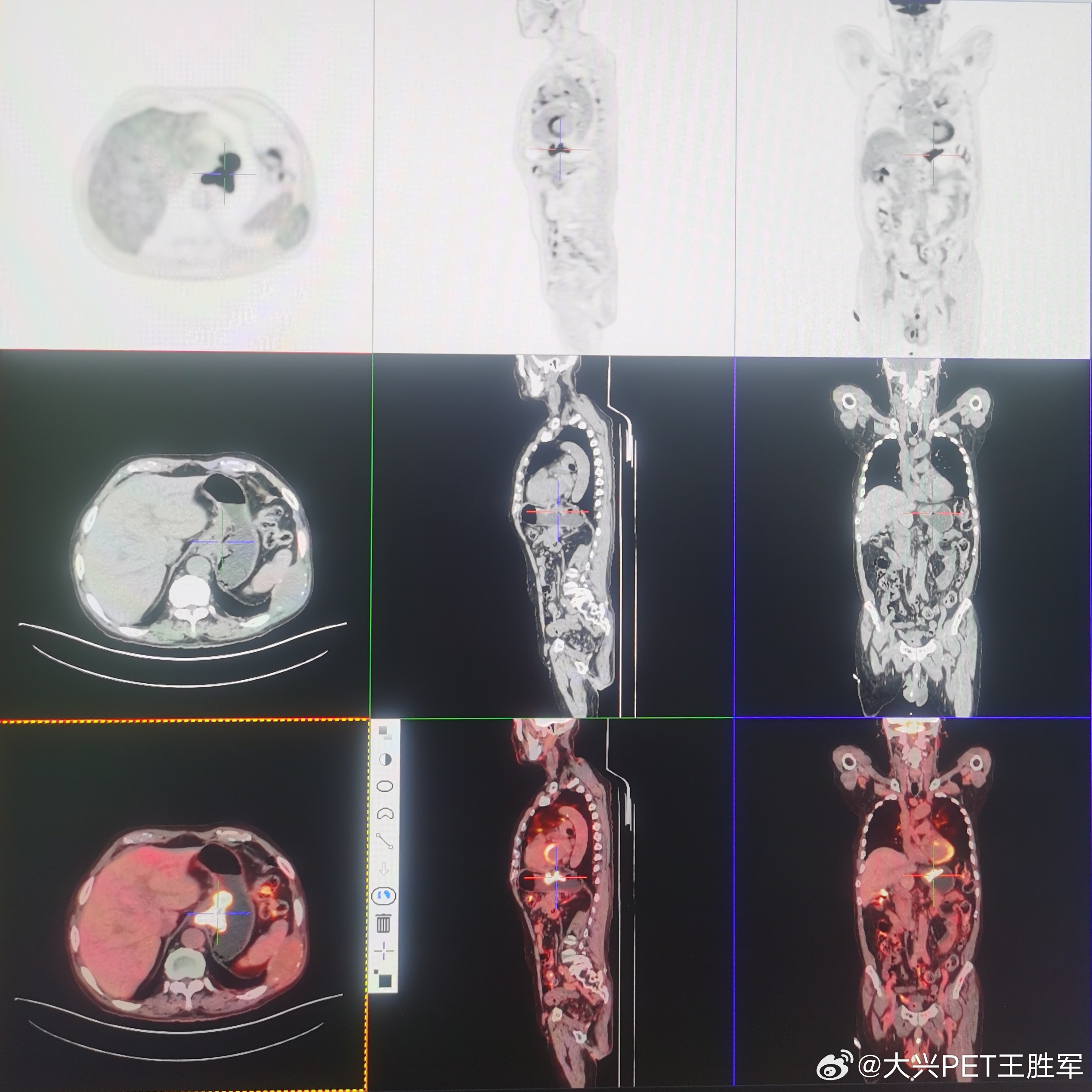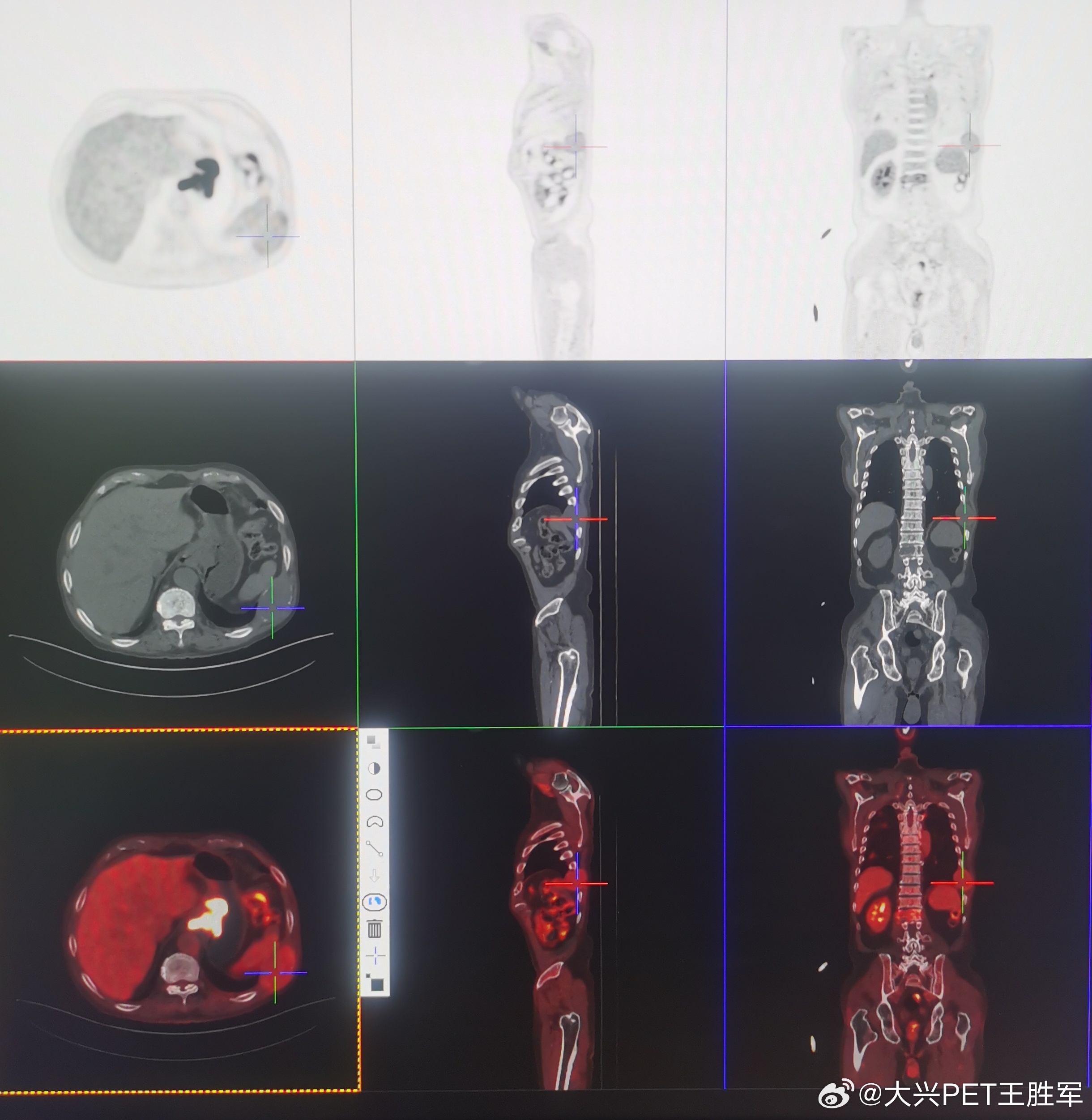 PET/CT比常规CT和核磁共振的优势在于全身无间断连续显像,发现肿瘤更全面,有时候可以同时发现多个不同的原发肿瘤,并且能够精准判断哪些转移瘤是哪个原发肿瘤转移过去的。比如,下面一个怀疑肾癌的患者,做了PET/CT,不仅诊断清楚了右肾癌(第一幅图),还发现了没有任何消化系统症状的胃癌(第二幅图),以及肋骨的转移瘤(第三幅图)。通过代谢程度,PET/CT还基本能够判断骨转移瘤是来自肾癌的,而不是胃癌的,因为胃癌的代谢程度远远高于骨转移瘤的代谢,而肾癌和骨转移瘤的代谢更为相似一些,所谓“儿子更像老子一些”。医疗科普肿瘤