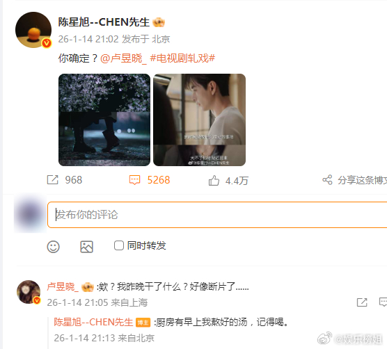 陈星旭回复卢昱晓《轧戏》陈星旭卢昱晓互动谁嗑到了,宇总嘴上说“没当真”,心里已经