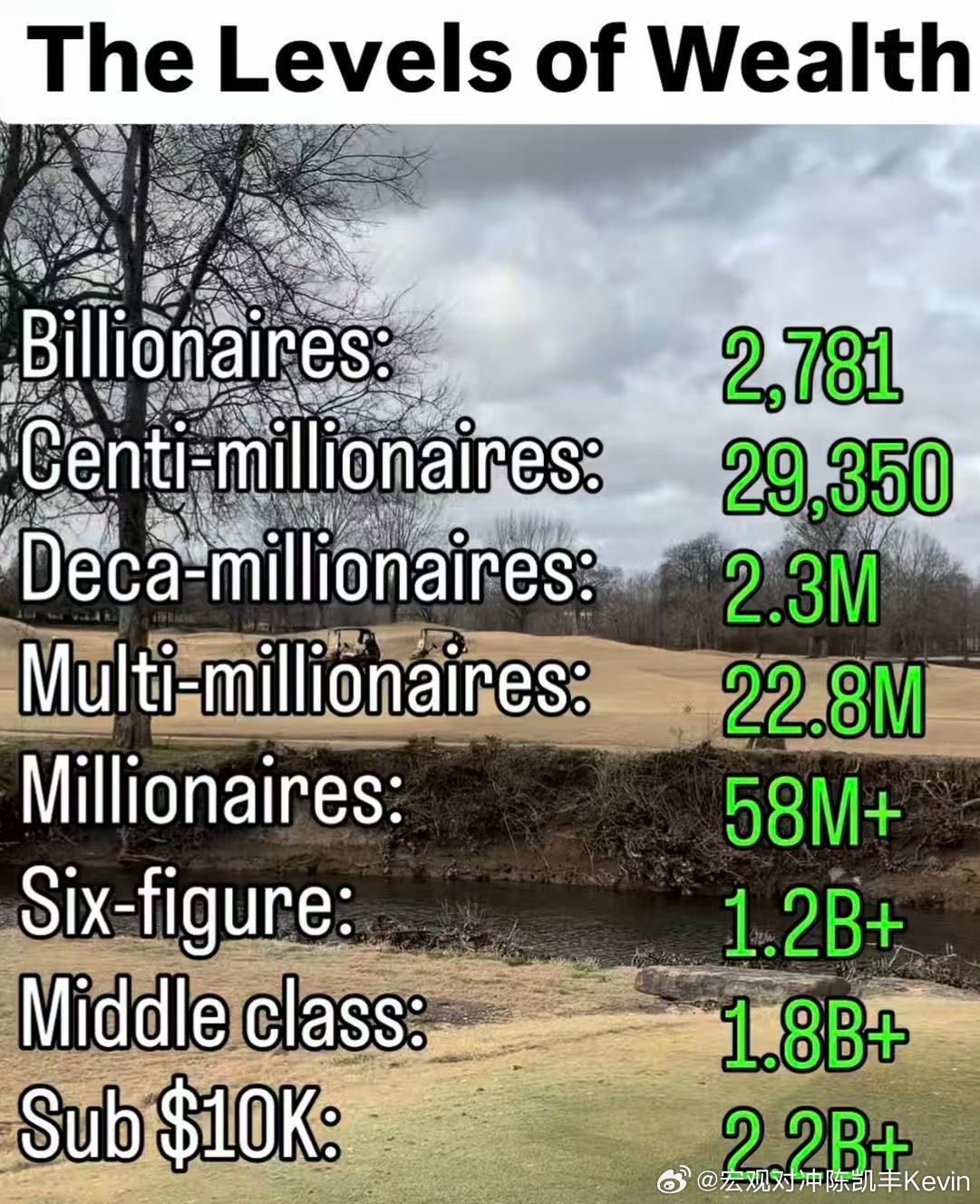 全球财富分配:拥有十亿美元以上财富的人一共2781个,附图为逐级向下,人数情况。在美国要想成为1%的所谓 one percenter, 需要个人财富净值超过1千3百万美元,也就是一亿软妹币 算不过来,美国3千多万人个人财富超过一亿宏观经济投资凯丰基本面雅典美国