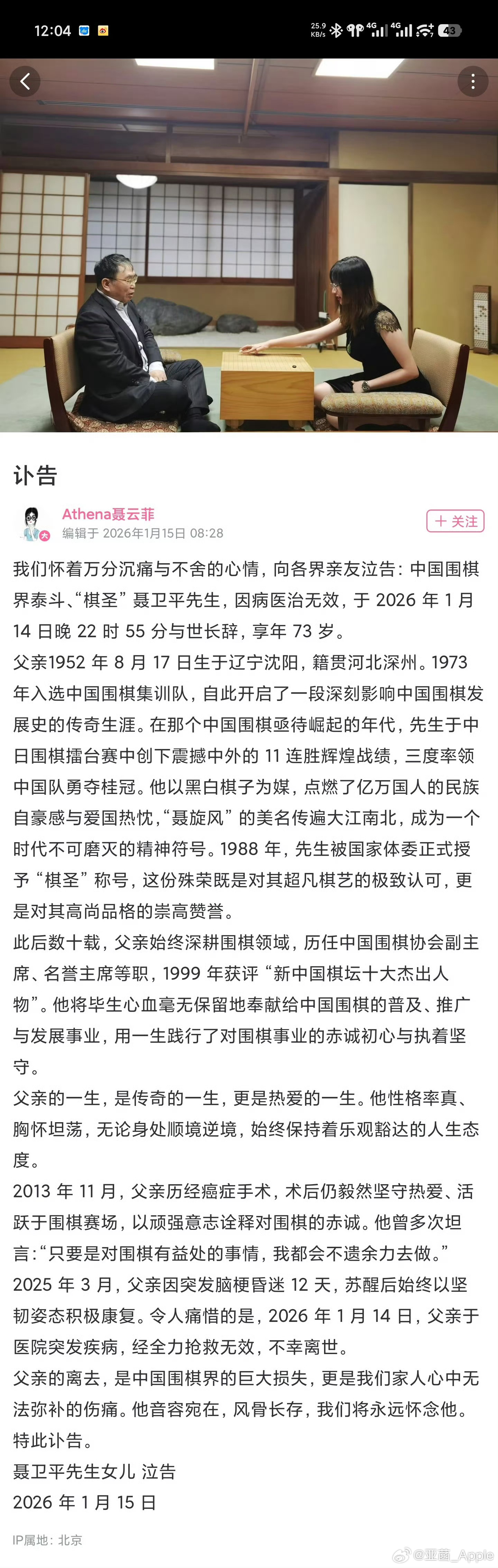 聂卫平逝世1月14日晚,“棋圣”聂卫平在北京病逝,享年74岁。聂卫平在20世纪80年代的中日围棋擂台赛中,作为主将力挽狂澜,连胜多位日本超一流棋手,创造了“擂台神话”,极大振奋了民族精神,被当时的国家体委和中国围棋协会授予“棋圣”称号。1985年8月27日,聂卫平在第一届中日围棋擂台赛上顶住中方连输六场的压力,以2目半的优势击败了日本“超一流”棋手小林光一。在视频节目《中国体育英雄联盟》里,邓亚萍专访“棋圣”聂卫平,共同复盘34年前“最惊心动魄的一局”。节目中,聂卫平回忆:在这场比赛之前,日本人激发了我的斗志。那是在热海比赛,日本人找到一个日本最著名的“自杀”的地方,把我领到那参观。人家说“你要是不行就从这跳下去吧”。柯洁悼念聂卫平聂卫平生平聂卫平逝世