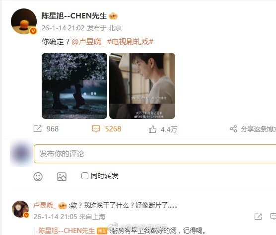 陈星旭回复卢昱晓《轧戏》陈星旭卢昱晓互动,两位是真会啊