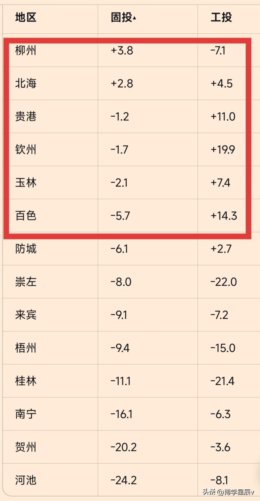 柳州、北海领先广西1-11月固定资产投资同比增速,钦州、百色、贵港、玉林领先工业投资增速。固投河池、贺州、南宁与桂林两位数下滑;工投桂林、崇左与梧州降幅较大。 钦州工业投资大幅增长,在于中石油钦州项目和上海华谊、国投电厂、恒逸等大型企业集中投资;化债显成效,固定资产投资增速柳州领先,山区河池与贺州固投下降较大,房地产占比较高的南宁,受房地产下降,固投下降随后,但工投下降不大。意外的是旅游城市桂林,两项指标均排靠后。 拉动经济增长之一的固定资产投资广西总体下滑8.1%,其中工业投资下降1.4%。各地应根据当地资源禀赋,因地制宜来发展经济,宏观层面重点在可发力地方寻找增长极、增长点,带带动全广西的发展,仍是广西努力方向。