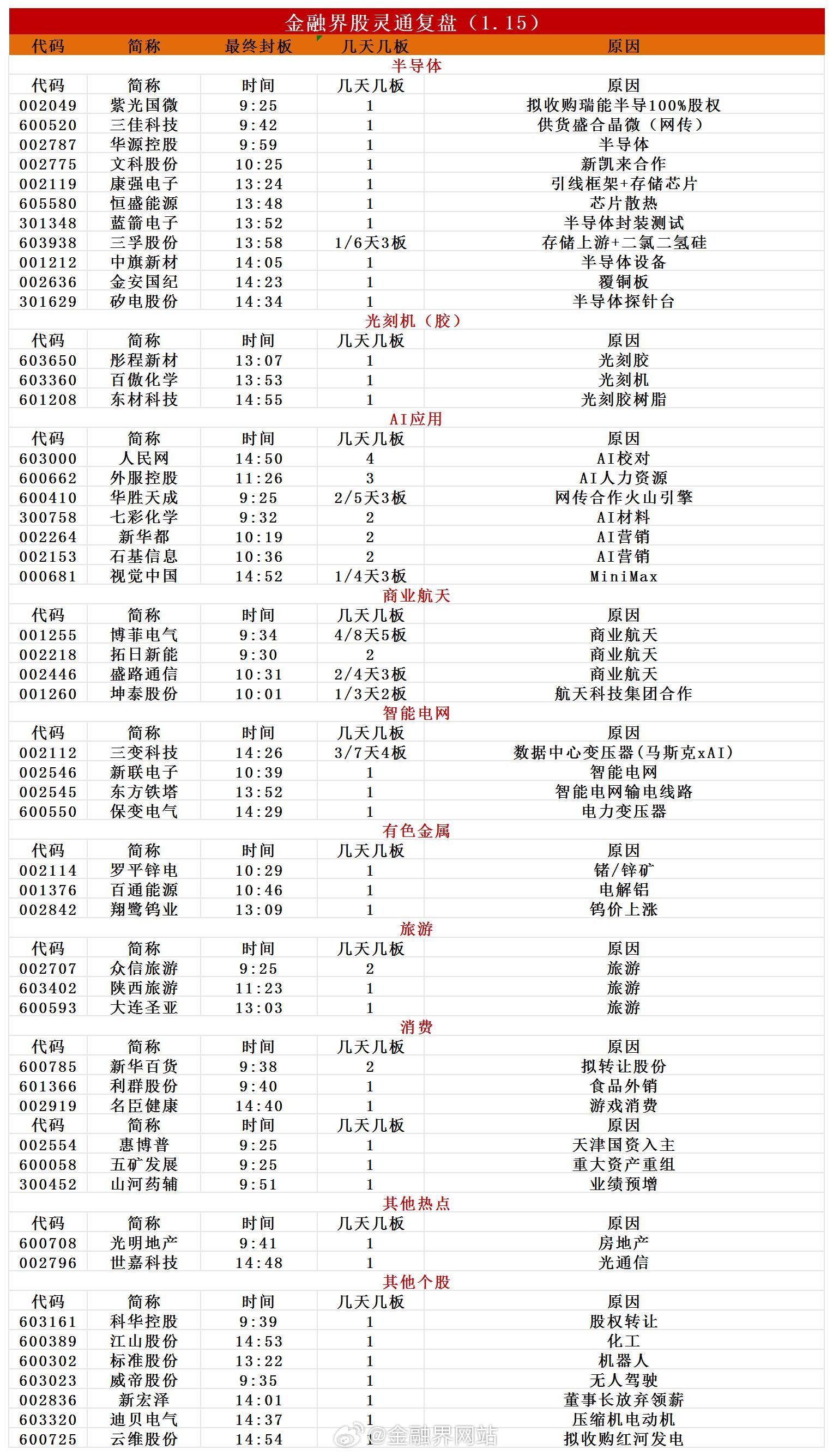 【涨停复盘:今日全市场共65只股涨停,连板股总数16只,半导体板块三孚股份六天3板、矽电股份20CM涨停!】 1月15日三大指数涨跌不一,沪指跌0.33%,深证成指涨0.41%,创业板指涨0.56%;沪深京成交额近三万亿,较昨日缩量逾万亿(沪深两市2.91万亿缩量1.04万亿)。盘面上热点杂乱,超65股涨停,3100只个股下跌;半导体午后走强、CPO概念拉升、旅游酒店活跃、有色金属走高,AI应用等板块跌幅居前,高位股退潮多股跌停。当日55股涨停,连板16只,封板率75%,焦点股如博菲电气8天5板等。相关热点:台积电2026年资本支出520-560亿美元;国网"十五五"投资预计4万亿;商用房首付降至30%;商务部反对日本要求撤回出口管制。详情:网页链接