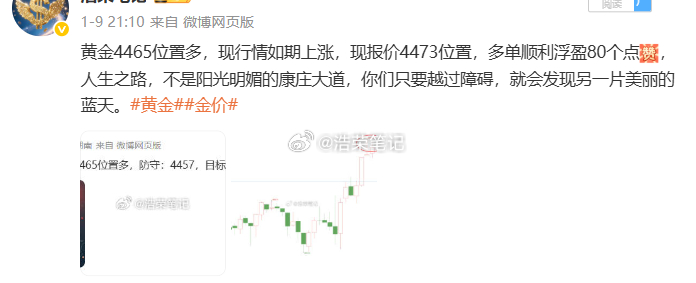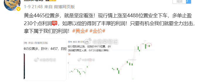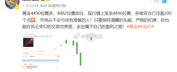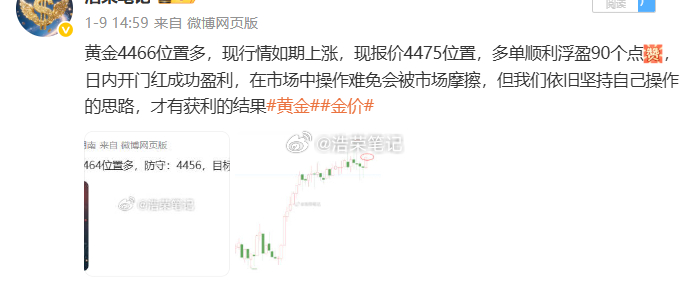 2026.1.9日周五操作记录总结!黄金4466位置多,在4475位置获利90个点利润黄金4465位置多,在4488位置获利230个点利润黄金4490位置多,4482位置加仓,在4496位置获利200个点利润博文公布3单,全胜!共收割520个点,真正的成功就是要面对未知、并坚定前进,在成功之前是都不确定是否能收获到理想的收益,但唯有用行动去检验、去感受、方知其中的奥妙。黄金 金价