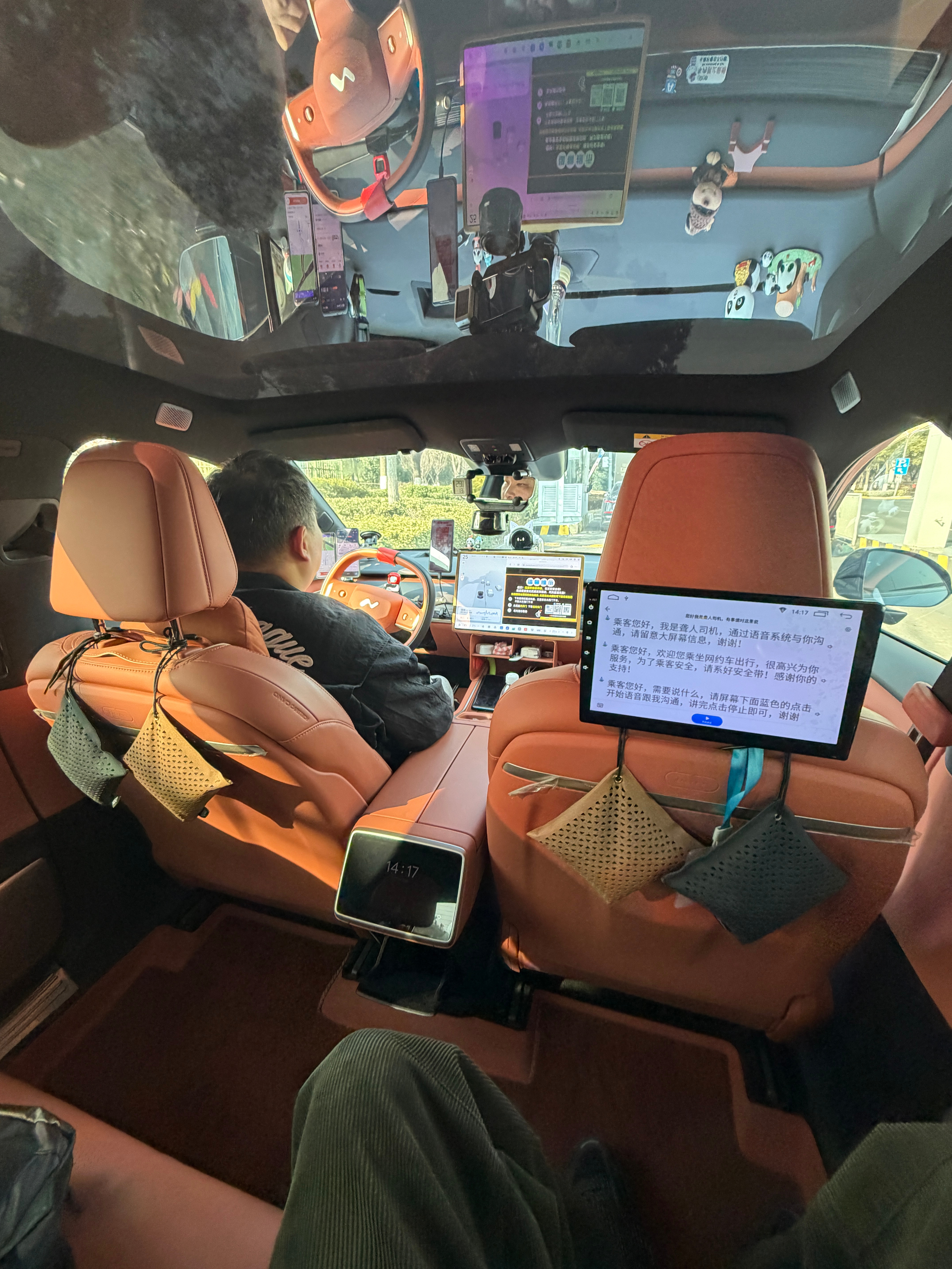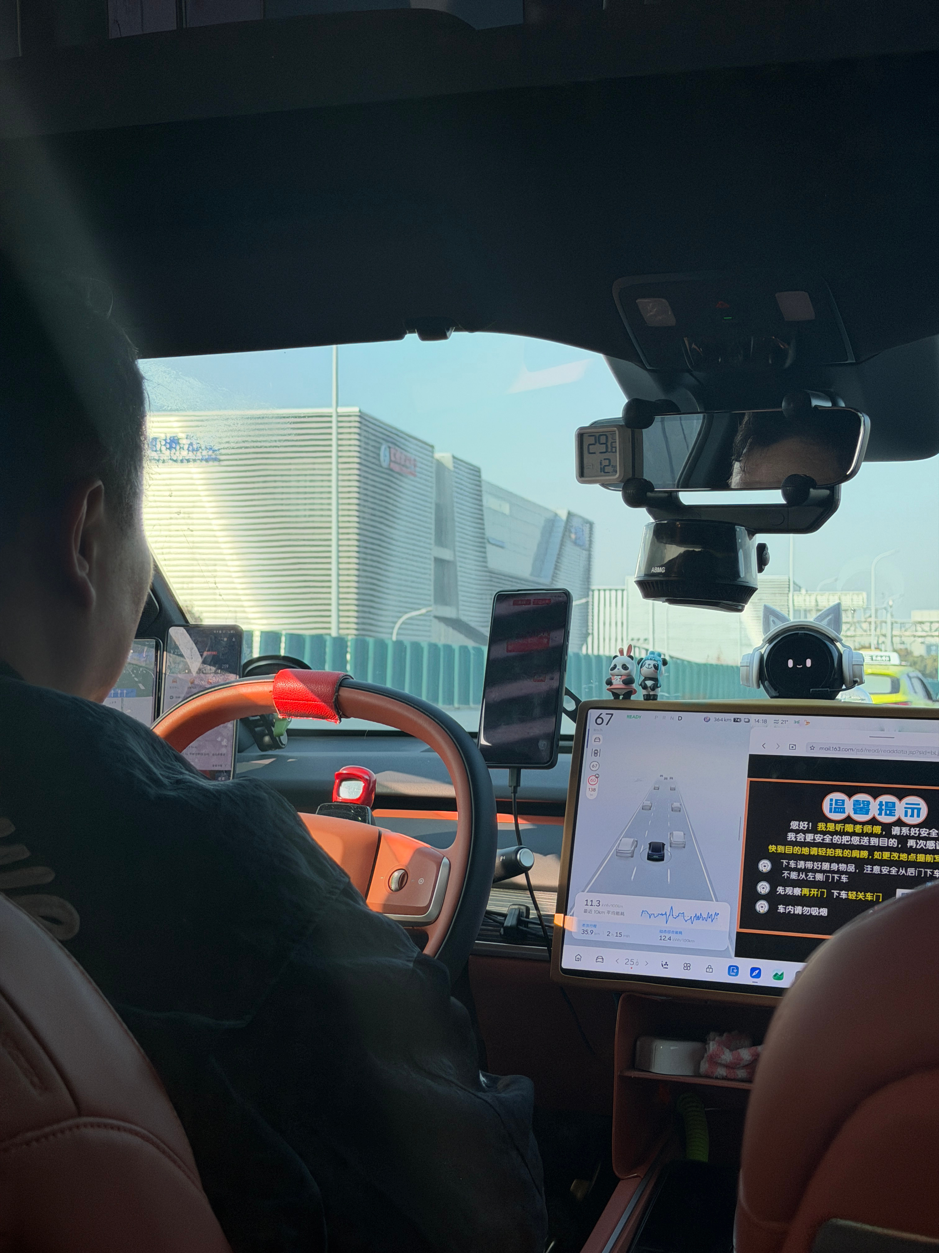 打快车,打到了一台乐道L60。原本还想上车聊聊,用这个车跑滴滴是啥体验,没想到师傅是聋人,只能通过文字沟通了。后面这个后装的屏幕,是可以通过麦克风识别我的声音转文字的。师傅交流只能通过输入法,我就没有深入聊了,会打扰师傅开车。这个车内布置得相当干净脚垫、座椅套还有一堆香氛,甚至后面还有苹果篮,不知道是不是官方商城的篮子,置物挺好。前排的设备就更多了。3台手机,一个用来交流,一个是常驻导航,还有一个是后台等单子,没有一个手机是用来看视频的,相当敬业。中控屏我看是用浏览器常驻了一个提示图片,屏幕下面还有一个储物盒,里面一些零碎。比较有趣的是,在方向盘DMS摄像头上,还有屏幕后面,师傅都加了Nomi,哈哈哈,甚至每一个Nomi都有一个头饰,头饰还是发光的!能看得出,师傅是真喜欢Nomi。本来今天废废的,又有干劲儿了,而且不管是啥工作吧,一定要找一个能取悦自己的点,比如师傅的车上,就有一大堆。 上海·上海虹桥国际机场