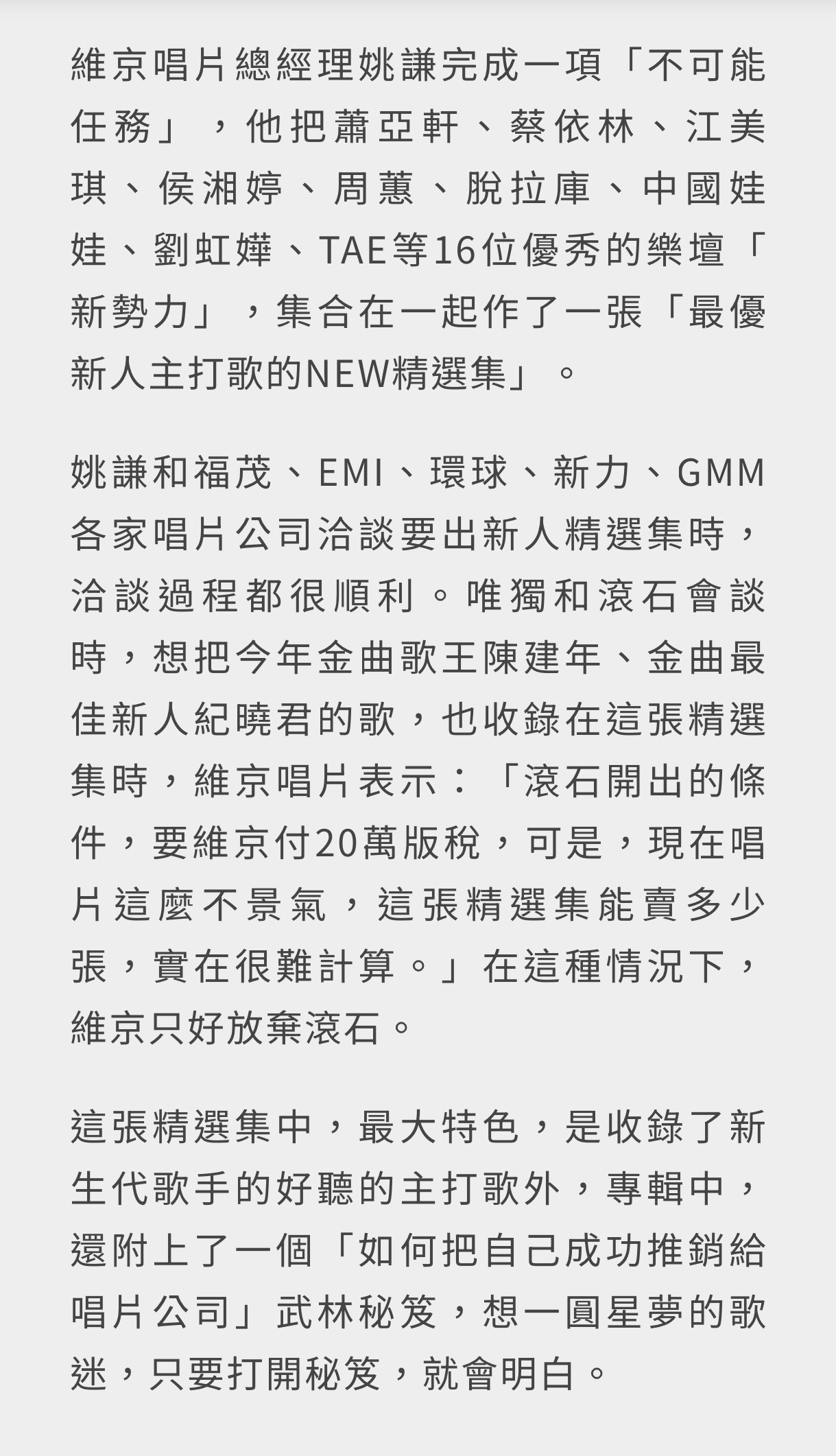 翻到维京唱片时代的一张老照片,黃立行、侯湘婷、江美琪、萧亚轩及霍经伦在校园大受欢迎,又让我们想起维京唱片时代的一些美好回忆。当年姚谦还做了一件大事,和福茂、EMI、环球、新力、GMM各家唱片公司洽谈,集合1999-2000出道的新人,包括萧亚轩、蔡依林、江美琪、侯湘婷、周蕙、脱拉库、戴佩妮、中国娃娃、刘虹嬅、TAE等16位优秀乐坛「新势力」出了一张新人精选集《NEW!最优新人主打歌》,有人买过这张专辑吗?