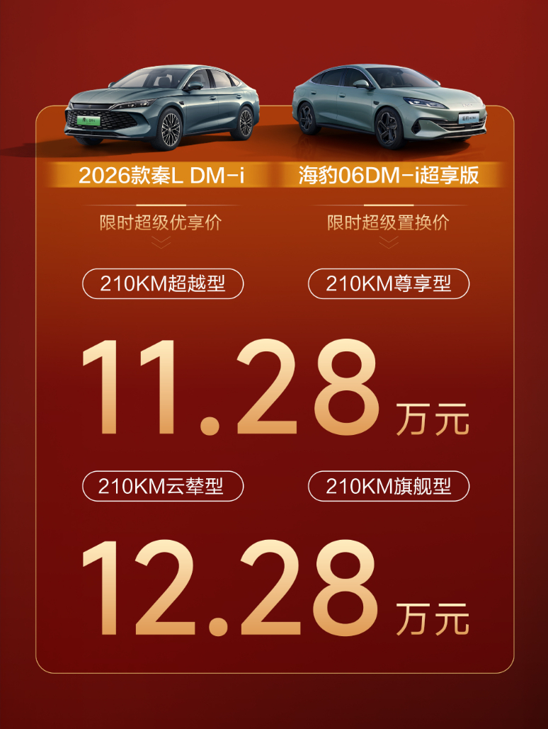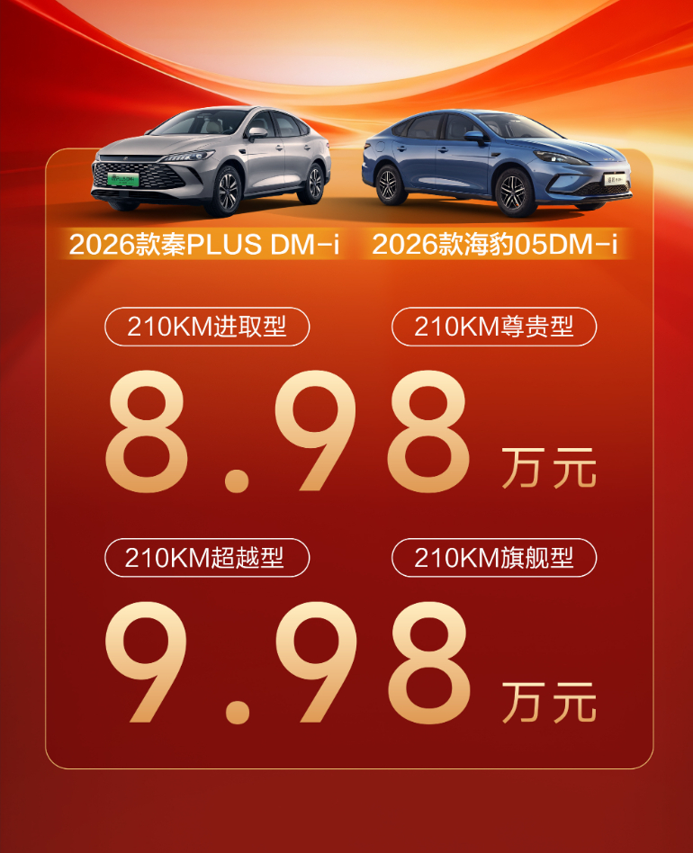 长续航插混究竟有没有必要?市场上其实已经给出答案了,这段时间,2026款秦家族上了长续航版本,秦Plus DM-i/秦L DM-i同步新增210长续航版本!车辆售价分别为7.98w和9.68w起,依旧性价比啊拉满。首先是搭载了一块25.28kW·h电池包,综合续航达2110km,短途出行的纯电续航和远途出行的续航焦虑基本大小了。另外,还配备了天神之眼-C,高速领航、自动泊车等功能都配齐,智能座舱高阶版-DiLink 100、电子怀挡等也都有了。这次升级虽然没有“高大上”的升级,但是升级的都是最实在的价值点,兼顾了续航、安全、舒适。2026款秦家族长续航发布会秦家族210km大电池dmi来了