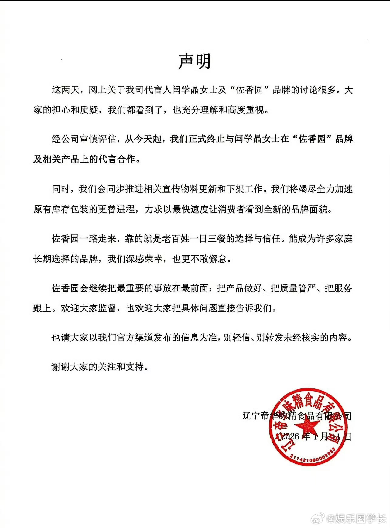 佐香园终止跟闫学晶的代言合作了