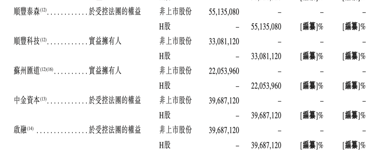 其中,顺丰泰森通过受控法团持有凯乐士5513.51万股的非上市股份,顺丰科技持有3308.11万股的非上市股份,两者合计持有约8821.62万股。对应持股比例在最新申请版本中尚以“编纂”列示,未披露具体数值。