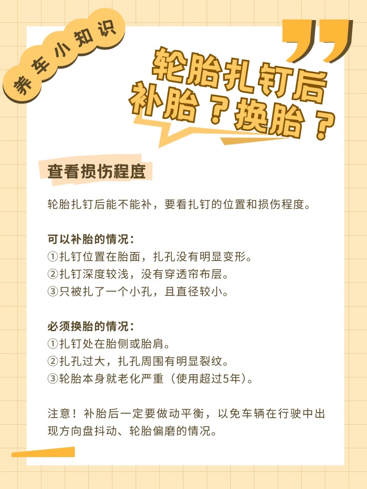 汽车轮胎扎钉后到底拔不拔?做错真的可能出大事!老司机教你正确处理🚨扎钉后先别急着拔!钉子能暂时堵住漏气口,一拔可能让胎压骤降,超危险。先观察漏气情况再做决定:👉轻微漏气:胎压降得慢,低速开去附近维修店。👉轮胎变瘪:肉眼能看出瘪了,赶紧停车找救援。轮胎扎钉补还是换?✅能补的 3 种情况:①扎在胎面,扎孔没明显变形。②扎得比较浅,没穿透帘布层。③只扎了一个小孔,直径小。❌必须换胎的 3 种情况:①钉子扎在胎侧或胎肩。②扎孔太大,周围还有明显裂纹。③轮胎本身老化严重(用了 5 年以上)。宝子们注意!补胎后一定一定一定别忘了做动平衡我与汽车的日常大v聊车