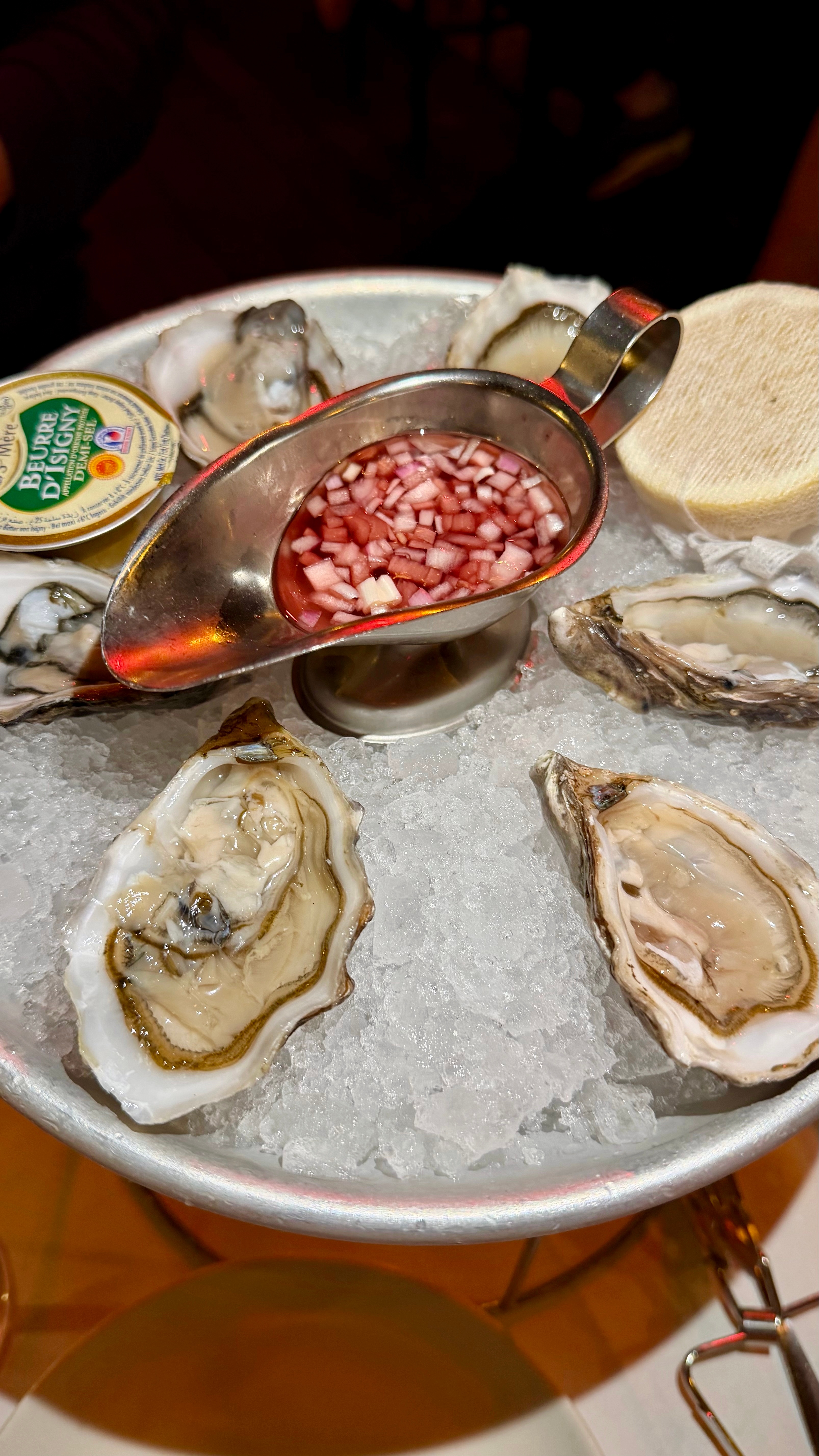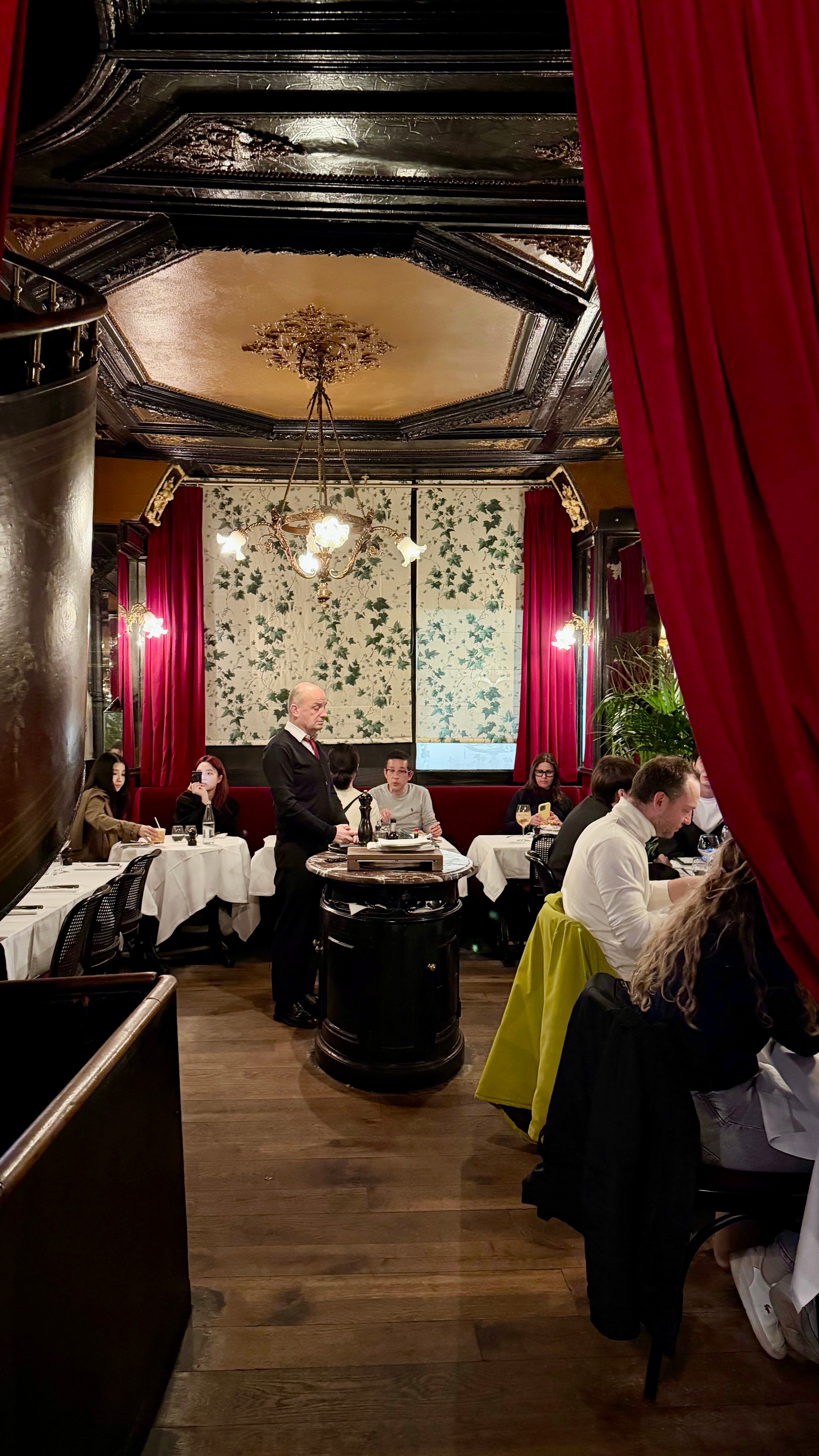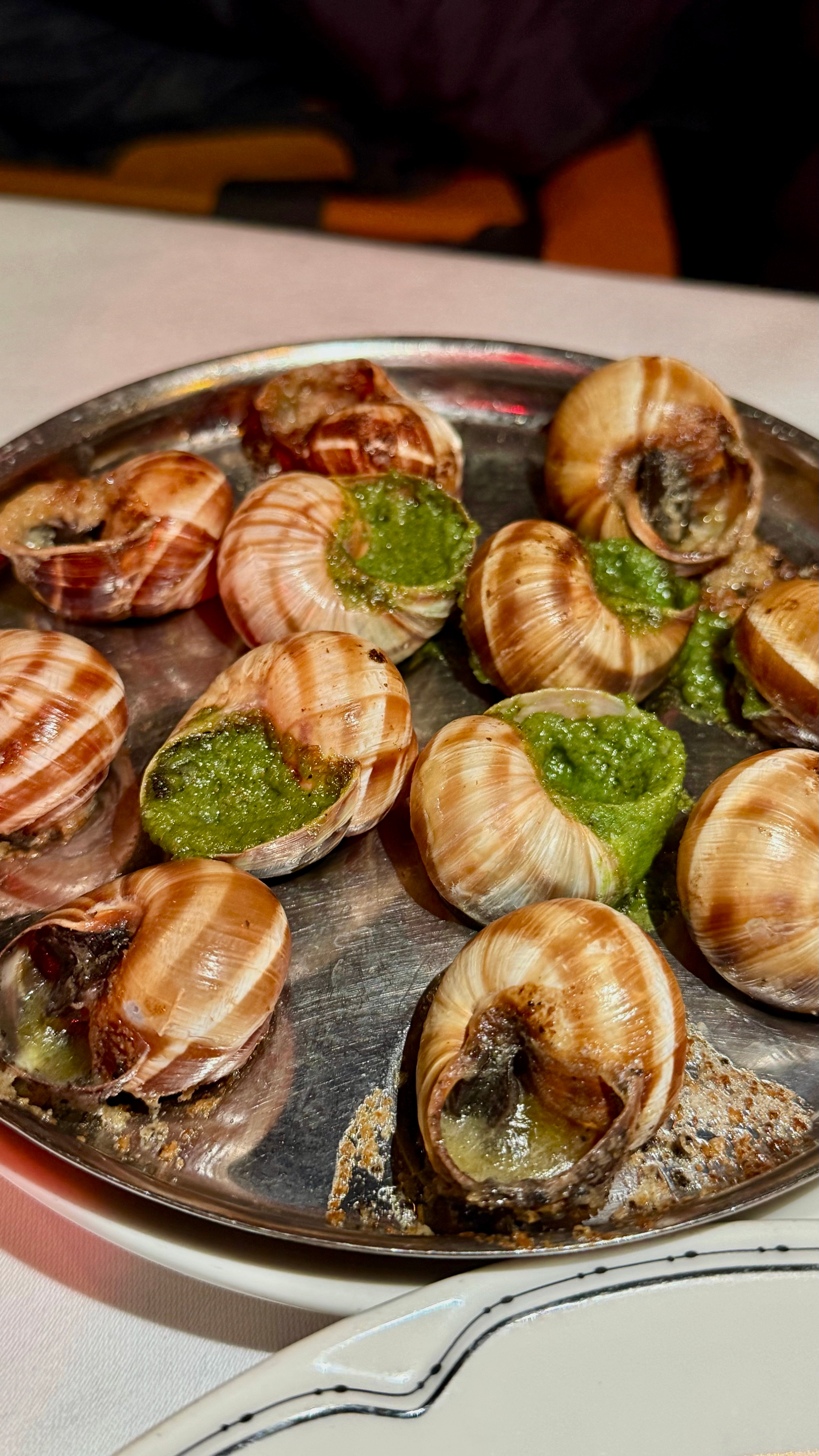 来巴黎必打卡的近200年老店,1832年环境确实有那味儿!第二帝国风格的复古装潢,水晶吊灯配木质雕花,氛围感直接拉满,拍照特别出片。我们仨都不会法语英语,正对着菜单抓瞎时,隔壁桌的国产小帅哥主动过来帮忙点单!店里服务也很在线,服务员会主动加水换盘,虽然语言不通但手势交流毫无障碍。菜品里招牌焗蜗牛蒜香浓郁,一口一个超满足;生蚝新鲜滑嫩,搭配红葱头醋汁绝了;鹅肝牛排的鹅肝香嫩细腻,但牛排有点柴,口感跟前几天吃那家差远了(价格也差远了)。沙拉清爽解腻,红肉配着红酒、朋友配的啤酒和矿泉水。三个人吃下来190欧,人均不到70欧,在巴黎百年老店这个价位算合理。虽然牛排略踩雷,但体验感还是拉满了,感谢热心小哥的神助攻!巴黎美食法国旅游豆花名宿吃货团 法国·巴黎