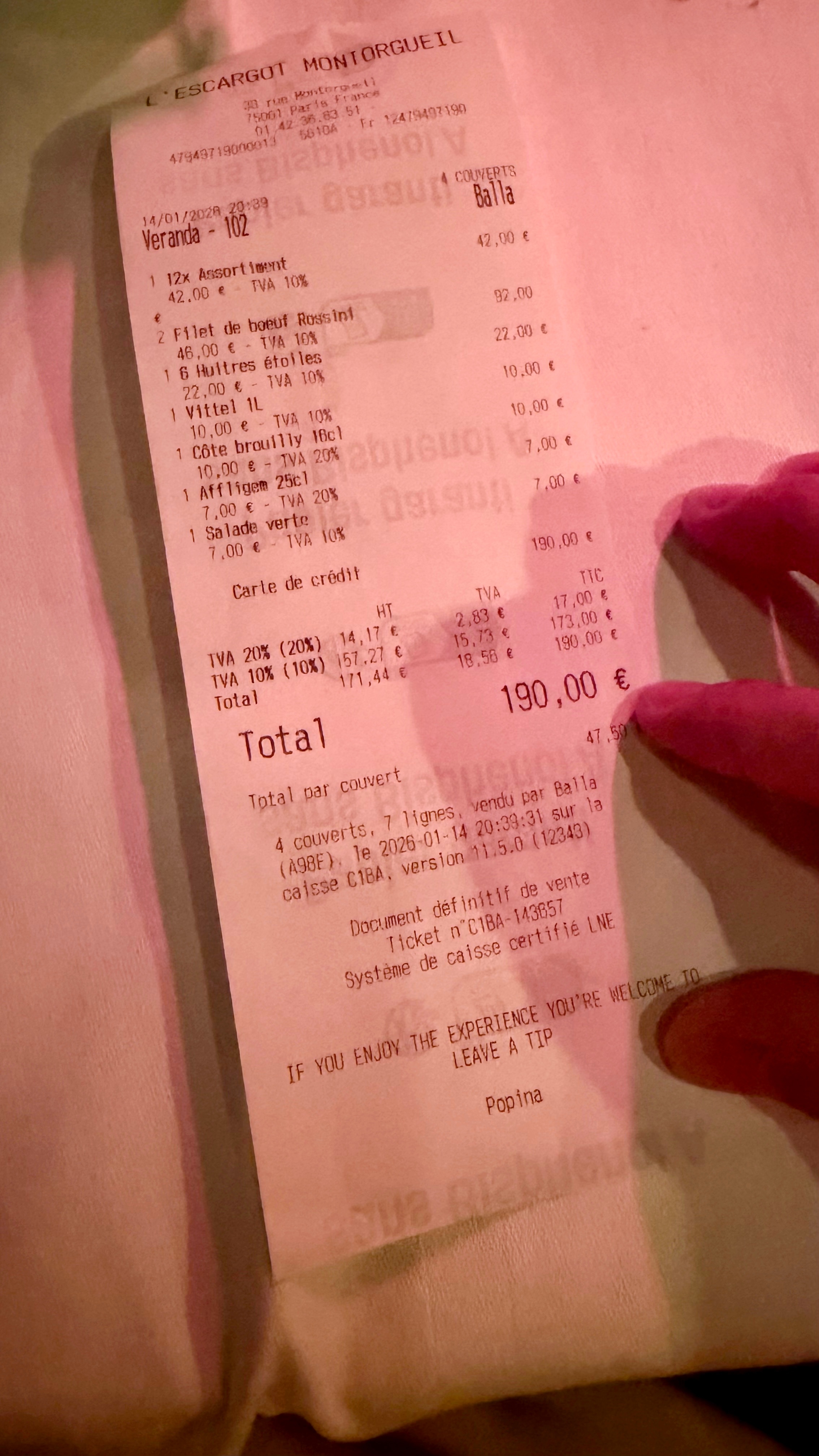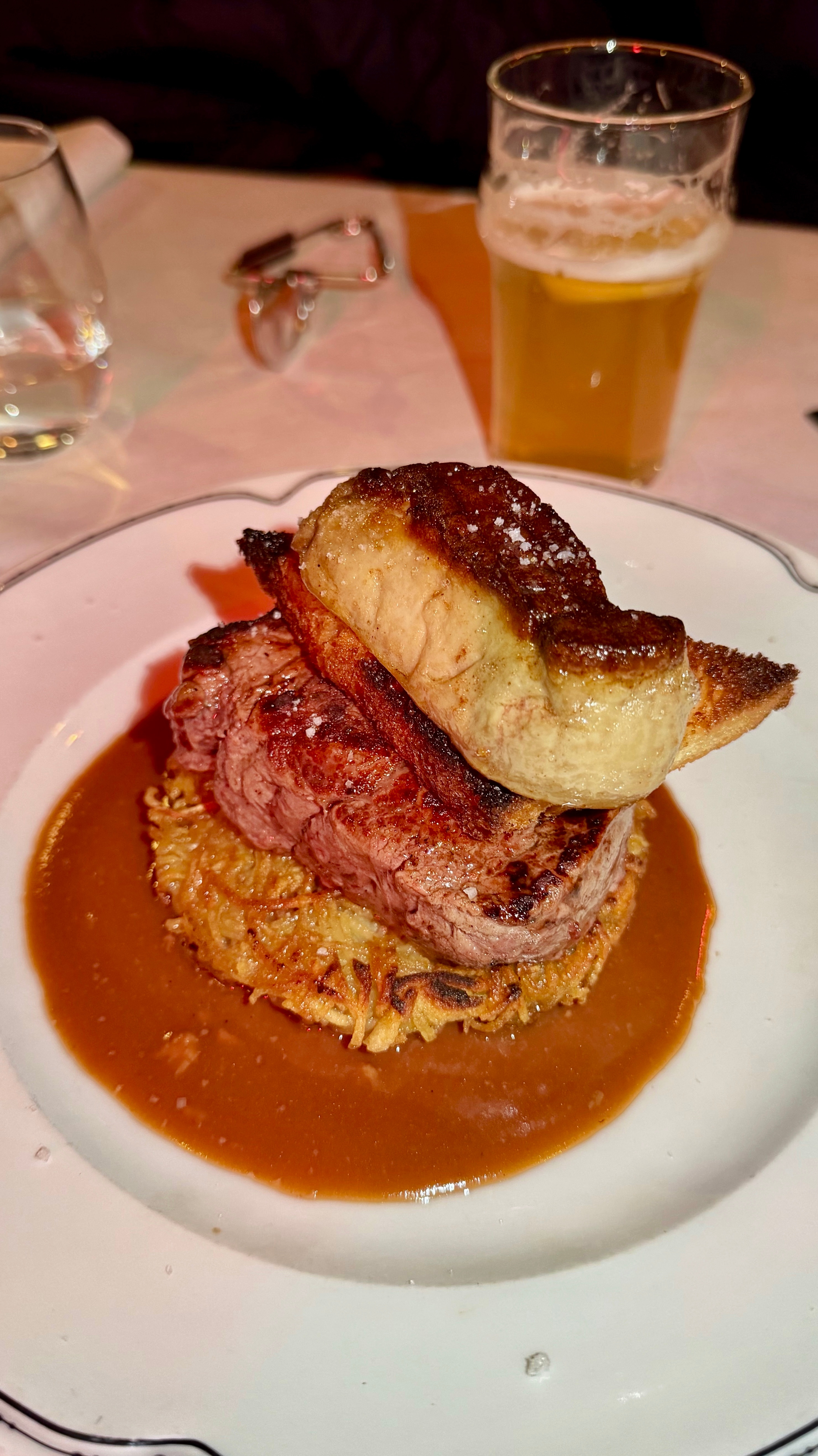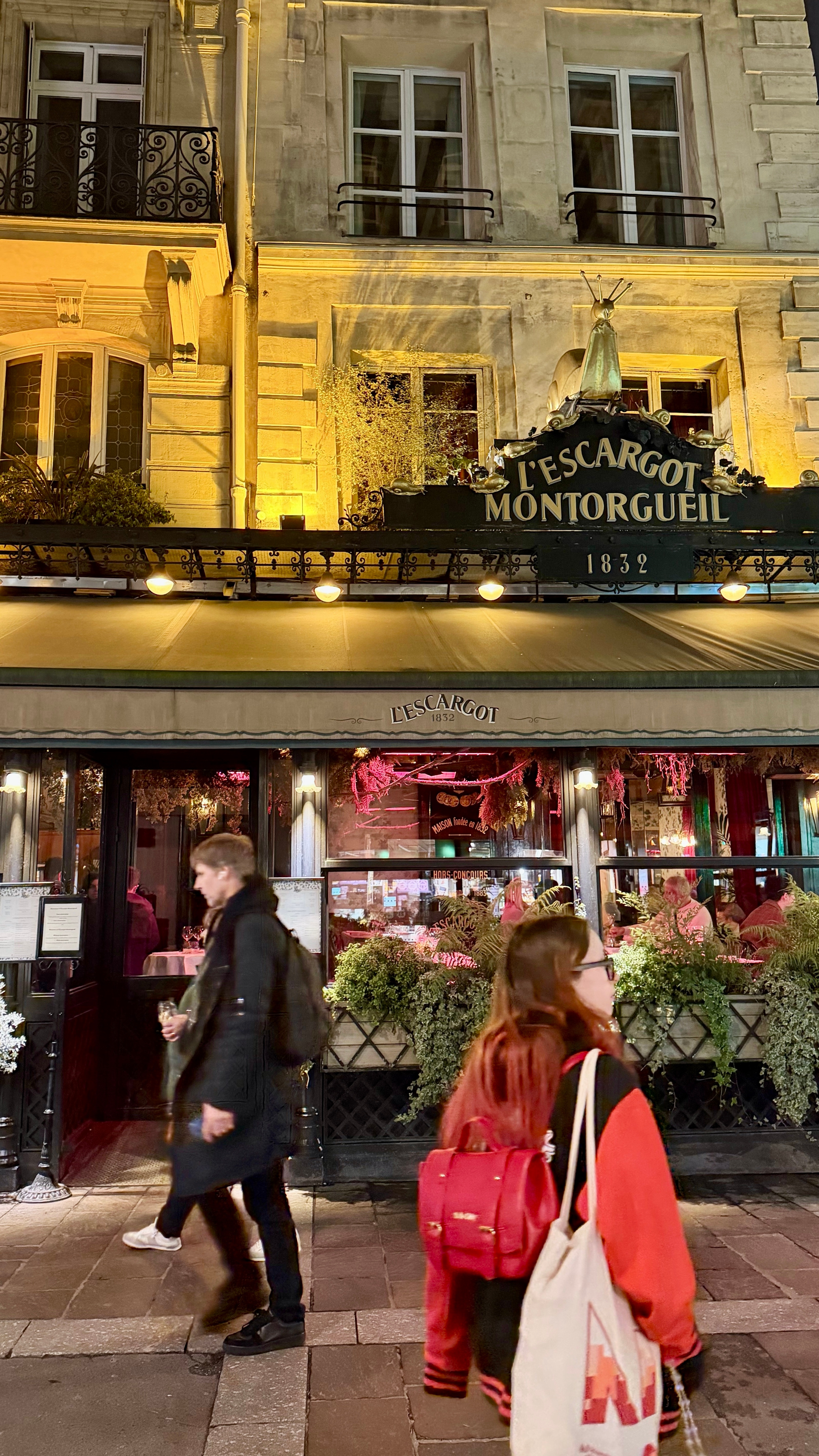 来巴黎必打卡的近200年老店,1832年环境确实有那味儿!第二帝国风格的复古装潢,水晶吊灯配木质雕花,氛围感直接拉满,拍照特别出片。我们仨都不会法语英语,正对着菜单抓瞎时,隔壁桌的国产小帅哥主动过来帮忙点单!店里服务也很在线,服务员会主动加水换盘,虽然语言不通但手势交流毫无障碍。菜品里招牌焗蜗牛蒜香浓郁,一口一个超满足;生蚝新鲜滑嫩,搭配红葱头醋汁绝了;鹅肝牛排的鹅肝香嫩细腻,但牛排有点柴,口感跟前几天吃那家差远了(价格也差远了)。沙拉清爽解腻,红肉配着红酒、朋友配的啤酒和矿泉水。三个人吃下来190欧,人均不到70欧,在巴黎百年老店这个价位算合理。虽然牛排略踩雷,但体验感还是拉满了,感谢热心小哥的神助攻!巴黎美食法国旅游豆花名宿吃货团 法国·巴黎
