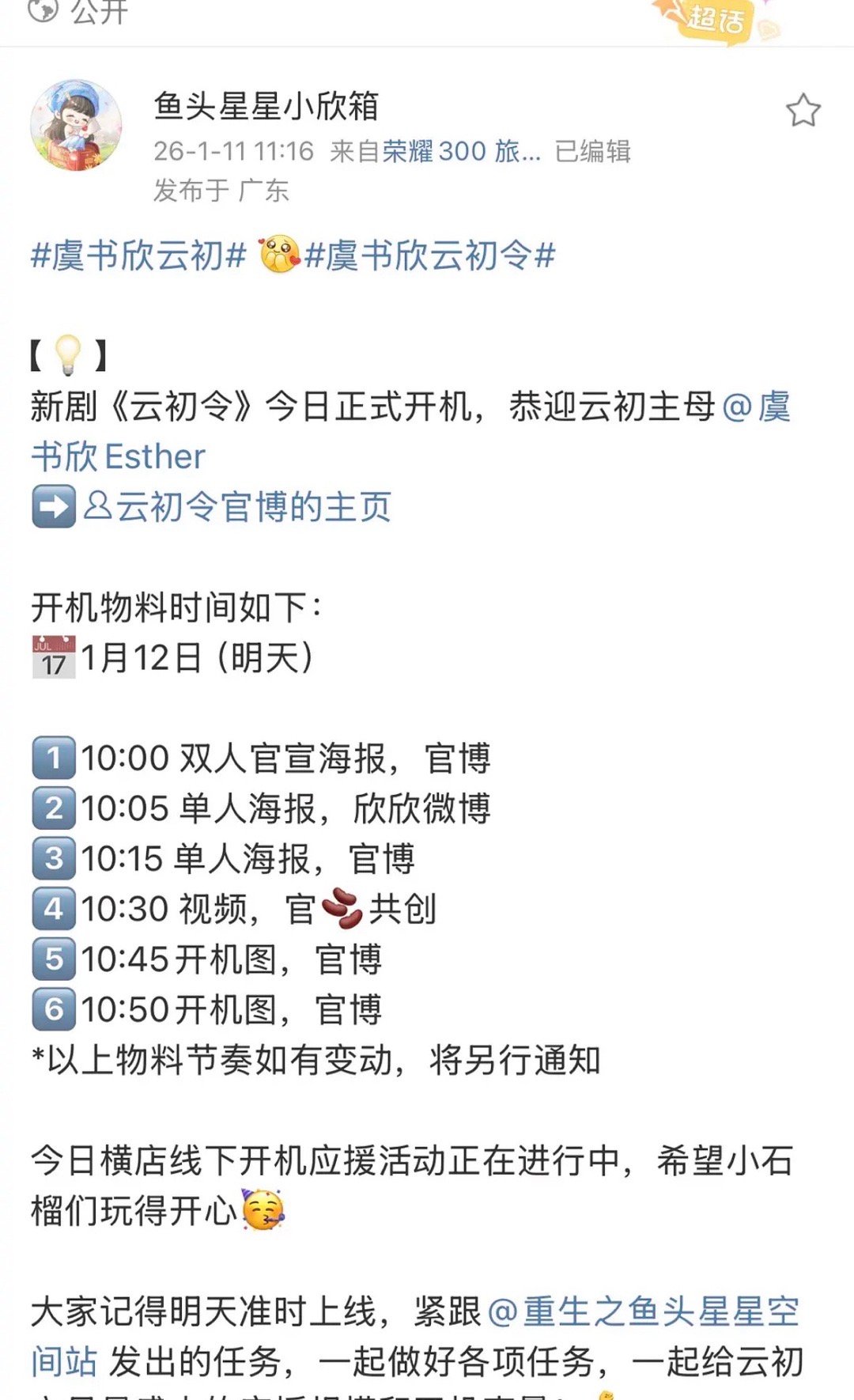虞书欣云初令今日正式官宣开机 🌸12号会发物料图 ,期待住了,海报太美了呜呜虞