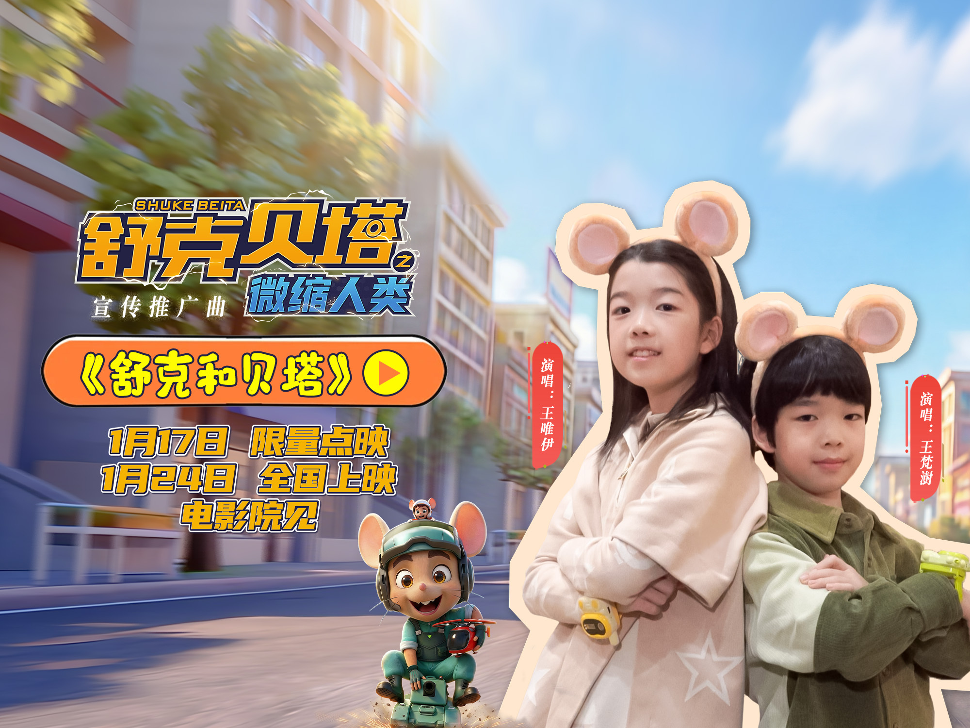 八个舒克贝塔把童年唱到银幕 电影舒克贝塔之微缩人类预售开启 谁懂啊!10后娃唱响“舒克舒克”的瞬间,DNA直接炸了!《舒克贝塔之微缩人类》预售+宣传推广曲MV双上线,吴雅婷、王栎鑫的女儿王唯伊、儿子王梵澍纯真献声,让童年旋律跨代圈粉。经典IP延续勇敢正义内核,全新冒险超吸睛,1月24日全国上映,大小朋友速冲预售,共赴冬日欢乐之约~