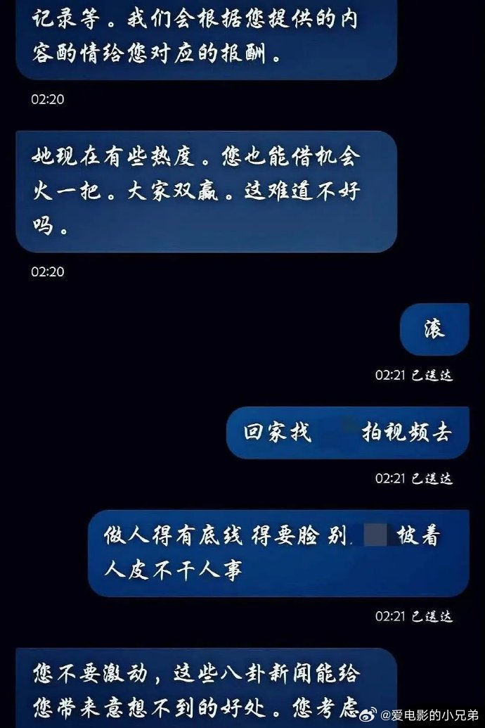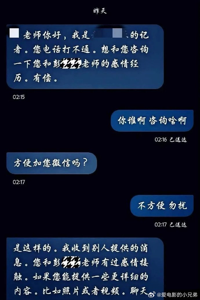 曝狗仔找彭小苒买八卦曝狗仔找彭小苒小学同学买八卦彭小苒发文曝光狗仔找同学买自己八卦,聊天截图是所谓狗仔冒充媒体和彭小苒小学同学的对话,狗仔表示“她现在有点热度您也能借此机会火一把”,彭小苒同学直接怒怼!彭小苒表示“但如果有人假冒媒体身份,玩儿身份诈骗,用不当手段搞信息买卖,那就超出了合理范畴,不仅可能违法,也会伤害媒体行业的公信力。”