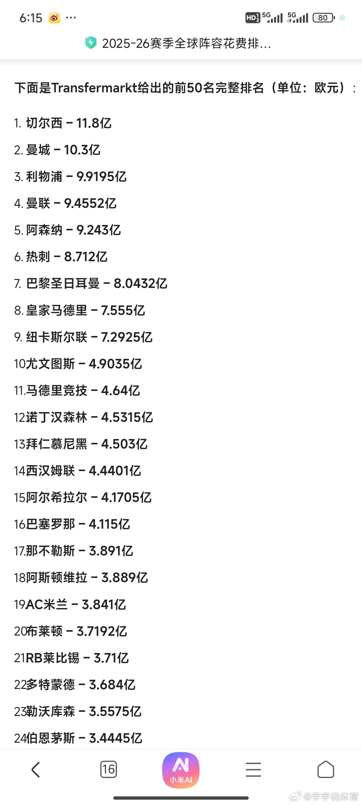 从曼城现有阵容的建队投入来看,曼城4连冠是理所应当的。近,Transfermarkt更新了2025-26赛季全球俱乐部阵容组建成本的最新排名,这个数据纯粹基于转会费累计(不含附加条款),直接反映了各家俱乐部在引援上的真金白银投入。结果让人大吃一惊:切尔西以惊人的11.8亿欧元高居榜首,这不仅是现役最贵阵容,甚至创造了足球历史新纪录!恩佐·马雷斯卡手下的这支蓝军,和曼城一起,成为仅有的两支阵容成本突破10亿欧元的球队,而且两者都来自英超。这份榜单前六名全被英超包揽:切尔西、曼城、利物浦、曼联、阿森纳、热刺。英超俱乐部在前25名里占了12席,足见英超在转会市场上的财力有多恐怖。像纽卡斯尔排进前十就不奇怪了,但诺丁汉森林、布莱顿、伯恩茅斯、布伦特福德这些“中游”球队也能和欧洲大陆豪门掰手腕,真的让人感慨英超的钱有多烧。