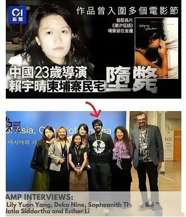 中国23岁女导演赖宇晴在柬埔寨金边离奇坠楼身亡案,有了新情况:金边警方以涉嫌暴力致人死亡,抓捕了2名嫌犯。去年12月30日0点30分,23岁的中国女导演赖宇晴从金边市一栋出租房的高处坠落,头部与身体遭受严重撞击,在送医数日后被宣告不治,于今年1月2日下午5时许死亡。警方监控公布,坠楼前被人带上楼。警方报告显示:事发民宅分为底层、一层和二层。底层为房东自住,一楼及二楼为出租房。一楼租给与赖宇晴相识的印度籍男子及中国籍女子,二楼则由一名法国籍男子承租。监控画面显示,12月29日晚上11时22分左右,一名法国籍男子回到住所打开院门时,死者正站在门外。随后死者被带入屋内并进入楼上居住区。至12月30日凌晨0时30分左右,监控记录到楼上有人交谈声,其后死者从高处坠落,一名印度男子与中国女子随即下楼查看并扶起伤者。医院出具的死亡证明显示,死者因头部与身体遭受严重撞击而身亡。警方并在案发现场栏杆上提取到指纹痕迹,作为后续调查证据之一。赖宇晴的初中同学在事发后接受极目新闻的采访,称事发前还和同学见面,不像会轻生的人。「事发前两周,赖女士还和她的初中同学在北京见了面,并向同学们展示了她的艺术作品,之后赖女士就去了柬埔寨。“在赖同学的社交账号上,我看到不少人在评论区哀悼她的离世,我印象中赖同学性格积极开朗,不像是会作出轻生行为的人。”钟先生说。」今天(1月10日)警方披露,已将2名涉嫌谋杀案的中国和印度籍嫌犯移送法办。嫌犯分别JATLA SIDDARTHA,男,41岁,印度籍;李芳(Li Fang音译),女,43岁,中国籍。二人涉嫌在金边市桑园区一起故意暴力行为并造成他人死亡的案件。被逮捕的两人,均为死者生前朋友。釜山国际电影节时,JATLA SIDDARTHA和赖宇晴作为团队成员还一起走了红毯。另一嫌疑人中国籍女子LI FANG的社媒账号文案中还提到了嫌疑人印度籍男子Jatla Siddartha和死者赖宇晴。目前,柬埔寨警方并未披露有关上述两名嫌疑人的作案动机及具体作案过程等案件详情。公开资料显示,赖宇晴祖籍福建,出生于天津。曾在纽约、洛杉矶和多伦多留学。曾以导演、演员、音乐人的身份参与多部短片及长片的制作,作品入围多伦多国际电影节等活动。赖宇晴曾编导作品《爱是一本书》(Love is a Book)。2020年,编剧并执导短片《四非》上映。2021年,编剧并执导电影《沸腾》上映 。2024年,编剧并执导短片《爱是一本书》上映。2025年,编剧并执导电影《潮汐低语》上映 。