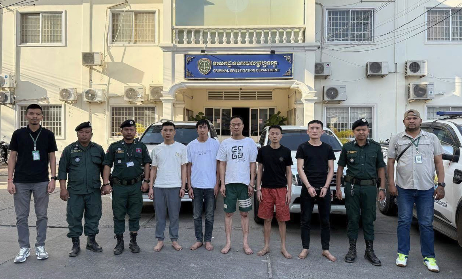 柬埔寨警方连破2起涉中国人绑架案,共10名中国人员获救,8名中国嫌犯落网。1月10日,柬埔寨警方公布近日连续破获两起涉及人口贩运、非法拘禁、酷刑虐待及敲诈勒索的严重刑事案件,多名中国籍嫌疑人被逮捕,多名受害者成功获救。第一起绑架案:一中国籍受害者在金边一处酒店内遭受酷刑并被勒索。警方随即对桑园区某酒店39楼及40楼实施突击搜查。行动中,警方成功解救一名47岁的中国籍男子梁涛(Liang Tao)。其被发现时已身受重伤,长期遭受暴力虐待。(图1)警方当场抓获一名32岁的柬埔寨籍中国男子马志伟(Ma Chi Wai)。(图2)1月9日,警方在德崇国际机场成功拦截两名企图潜逃出境的中国籍嫌疑人,分别为36岁的陈祥良(CHEN XIANGLIANG)和傅东东(FU DONGDONG)。他们察觉到事情败露,正企图潜逃出境。(图3)警方在现场查获多项与酷刑、暴力敲诈勒索相关的证据。警方指出,该团伙组织严密、分工明确,曾多次作案,不少受害者因被威胁“若泄露信息将被杀害”,长期处于恐惧状态而不敢报警。(图4、5)柬媒报道称,警方在办理该案过程中遭到多次干扰,后者警告相关人员立即收手。警方表示,案件正持续深挖,仍有同伙在逃,呼吁其他受害者尽快报案。第二起绑架案:绑匪索要5万美元赎金,警方解救9名被拘者。1月2日,一名中国女子唐某向警方报案,称其34岁的儿子殷星(音译)在柬埔寨遭不明人员非法拘禁,并被索要5万美元赎金。1月7日,警方实施突击行动,成功解救9名受害者,并当场抓获5名中国籍嫌犯,绑匪分别为:陈越(音译),男,40岁;梁昌来(音译),男,28岁;达哈尔(音译),男,28岁;童云(音译),男,35岁;卢一旺(音译),男,27岁。(图7、8、9)目前,上述5名嫌犯已被移送至金边市BKK区警察局,依法接受进一步调查和处理。