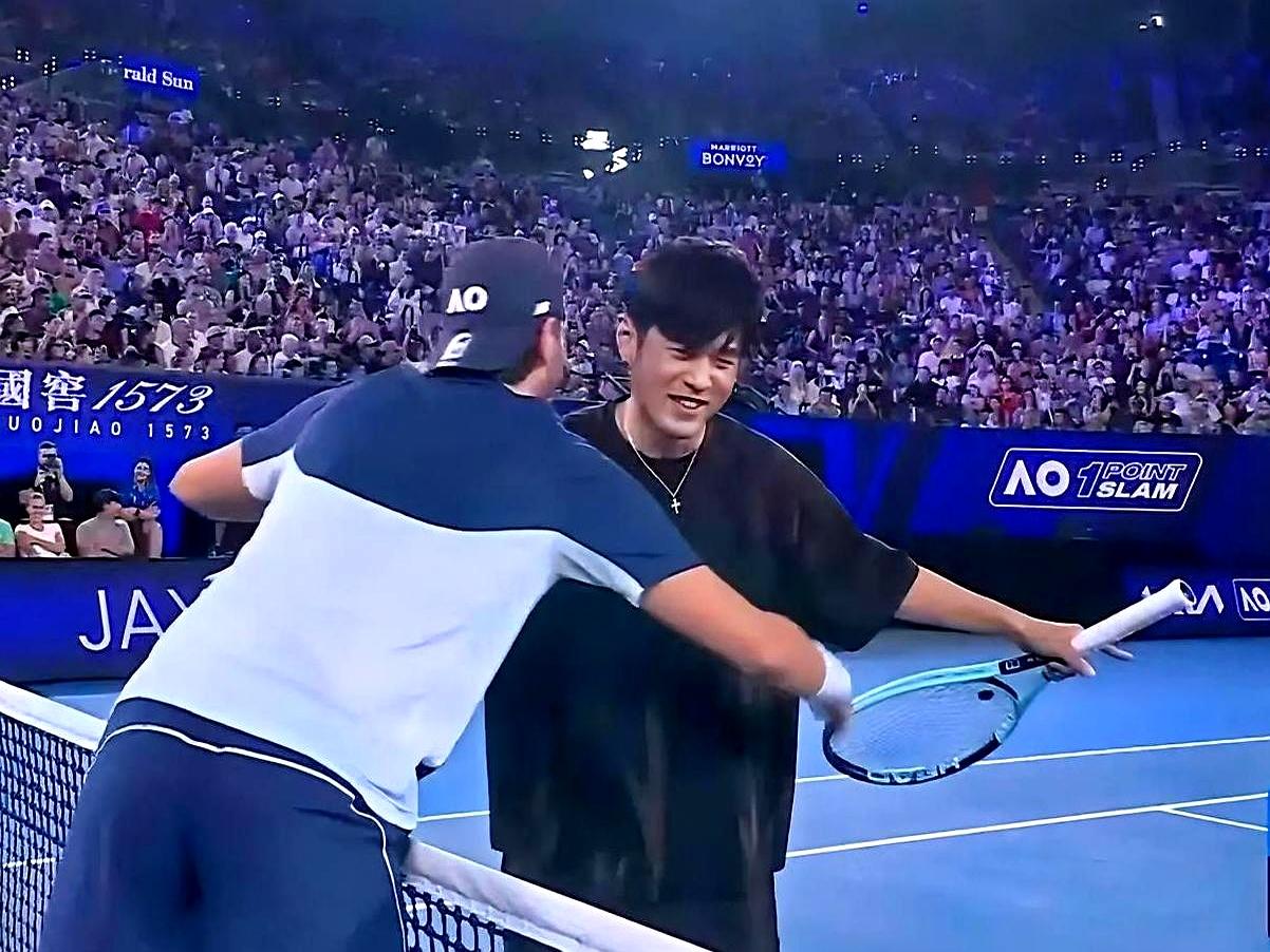 5秒淘汰,470万飞了 2026澳网新玩法,一球定胜负,冠军拿100万澳元。 周杰伦穿46号签,对上24岁陪练彼得,石头剪刀布输了接发权。 彼得直接ACE,球擦边,他没动就出局。练了几周,一秒没用上。 他把墨镜抛给看台小孩,笑说碰不到也好,钱照样捐。 现场大屏打出华语流行乐之王,全场跟着哼晴天。 我算了下,100万澳元能建四片乡村网球场。输归输,这波宣传值回票价。