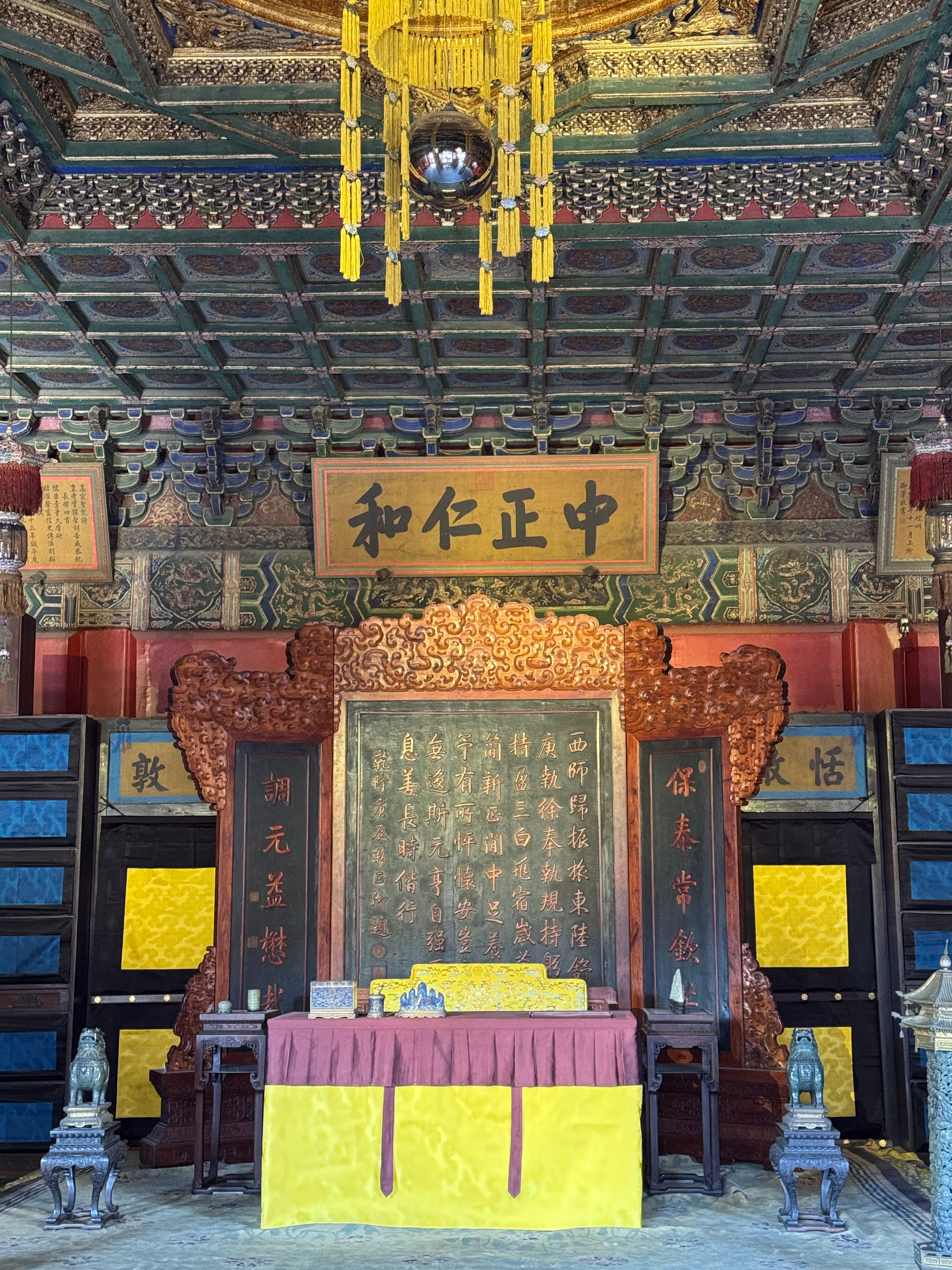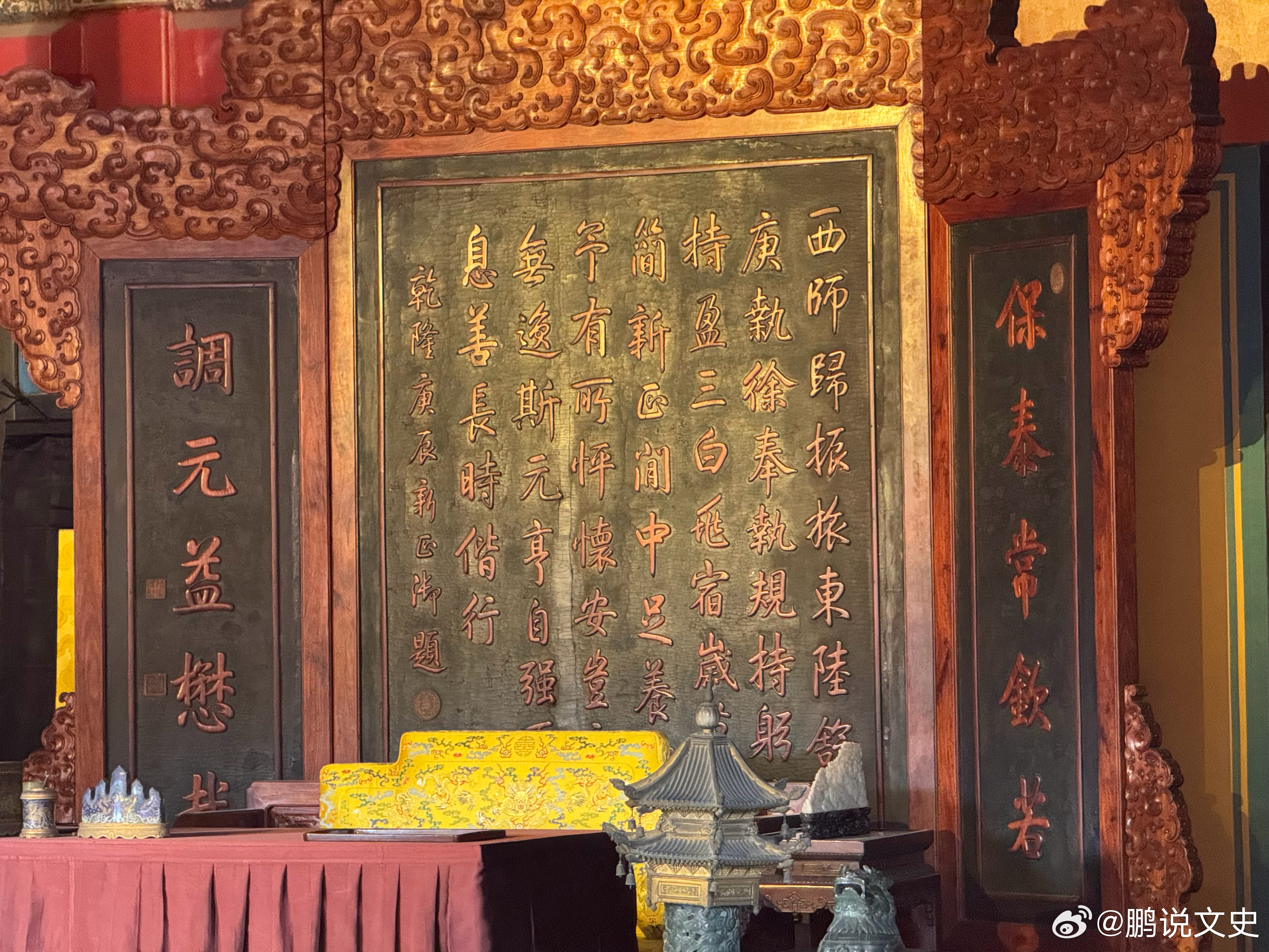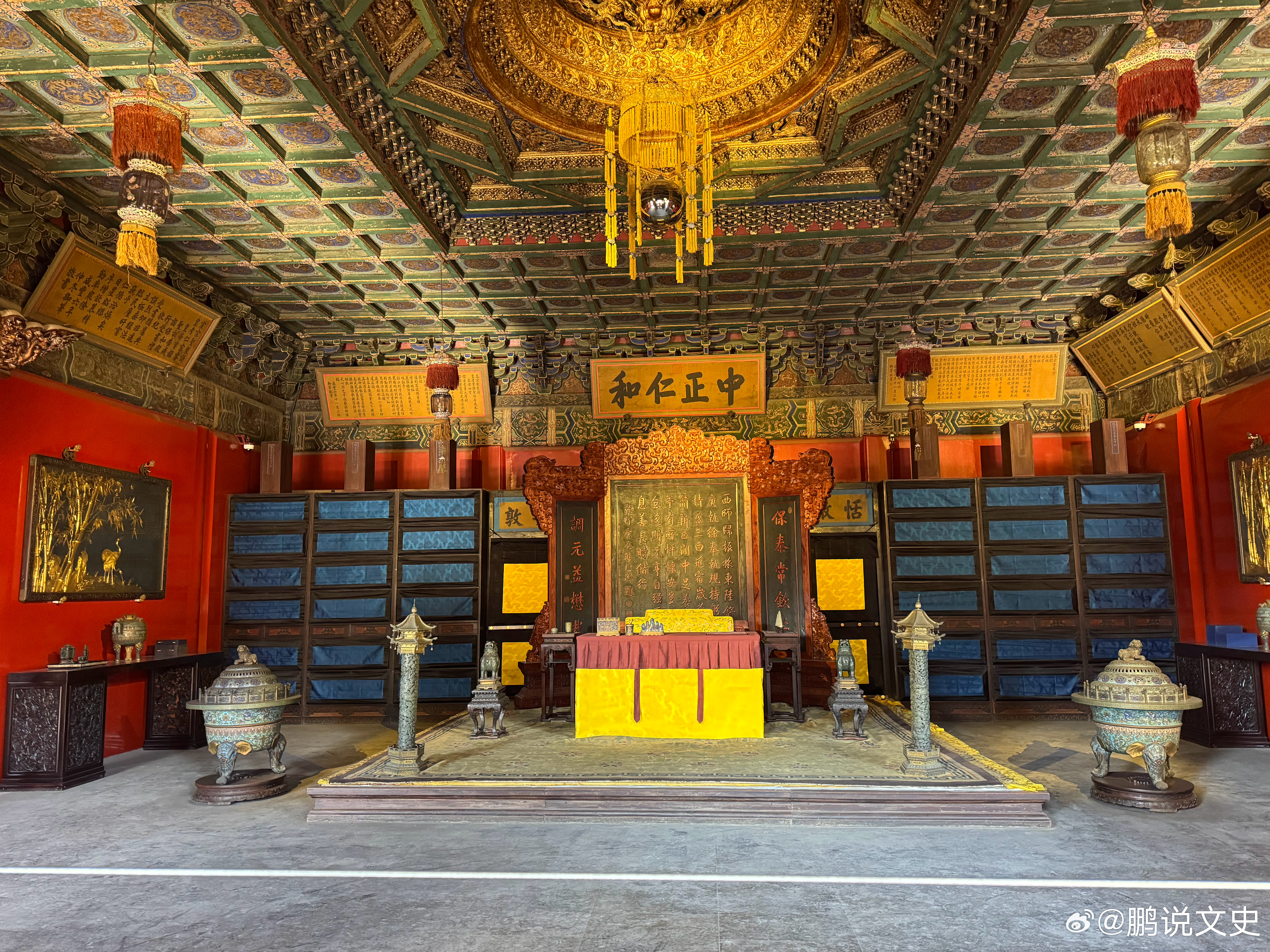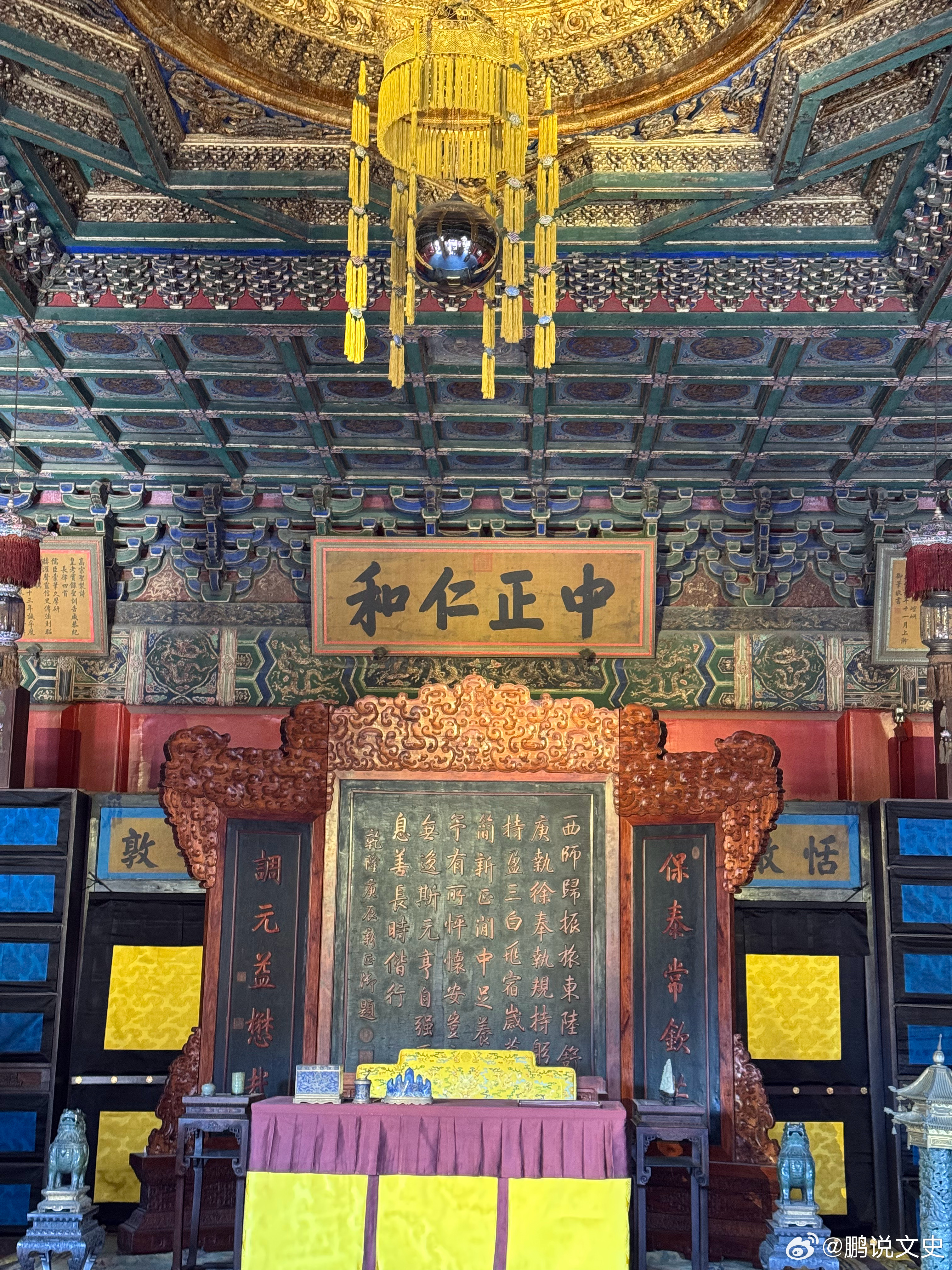 历史知识养心殿正殿:面阔7间(36米),进深3间(12米),黄琉璃瓦单檐歇山顶,正间和西次间、西稍间前出卷棚悬山顶抱厦,正中三间为一敞间,上书雍正御笔“中正仁和”四个大字,屏风背后有通往后殿的两小门,曰恬澈、安敦。北墙设书隔,东西按板墙壁与东西暖阁相隔,墙南各有一门通往东西暖阁。文物 北京·故宫博物院