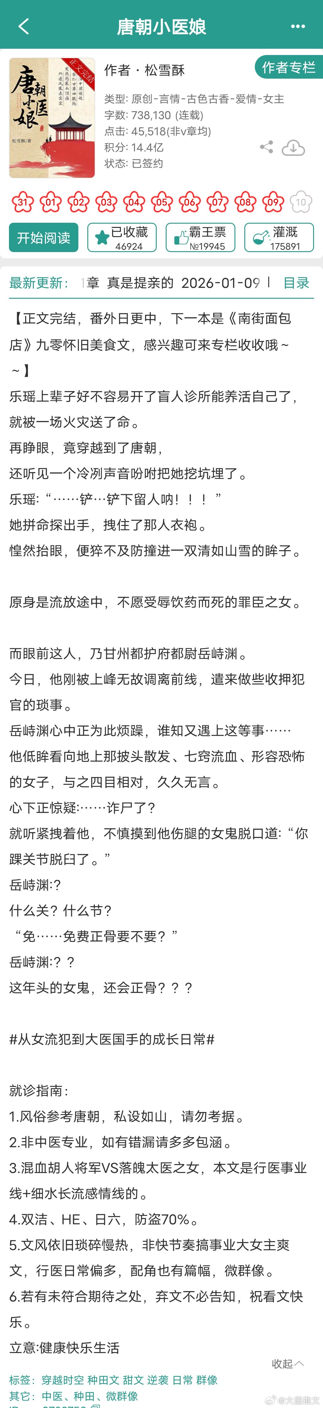 推文 这两本古代种田文正文完结啦绿豆红汤的《探花郎的极品二嫂》感觉作者格局更大,笔力更强了,女主聪明理智,目标清晰,看起来很爽,不窝囊松雪酥的《唐朝小医娘》从女流犯到大医国手的成长日常混血胡人将军vs落魄太医之女