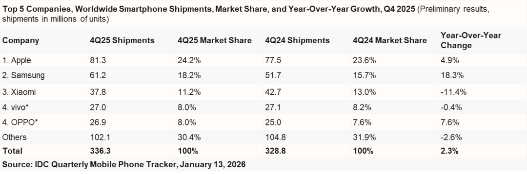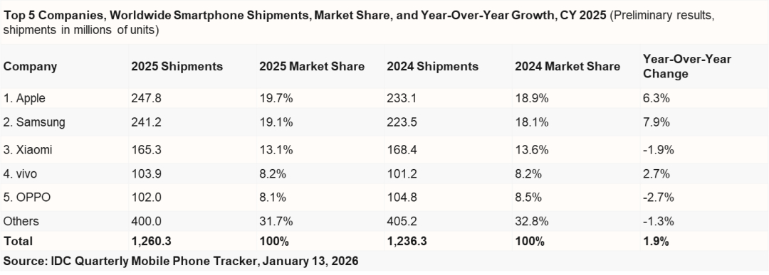 IDC发布《2025全球季度手机跟踪报告》1,2025 年第四季度(4Q25)全球智能手机出货量同比增长 2.3%,达到 3.363 亿部。2,2025 全年,全球智能手机出货量达到 12.6 亿部,同比增长 1.9%。3,苹果与三星成为前五厂商中增长最强劲的两家,同比增速分别达到 6.3% 和 7.9%。苹果连续第三年稳居全球第一,并凭借 iPhone 17 系列在中国市场的成功表现,实现了历史新高的出货量。4,2025 年第四季度,中国智能手机市场出货量约 7,578 万台,同比微降 0.8%,市场表现平稳,苹果、vivo、OPPO 位列出货量前三。5,2025 年全年,中国智能手机市场出货量约 2.85 亿台,同比下降 0.6%,华为、苹果、vivo 位列出货量前三。