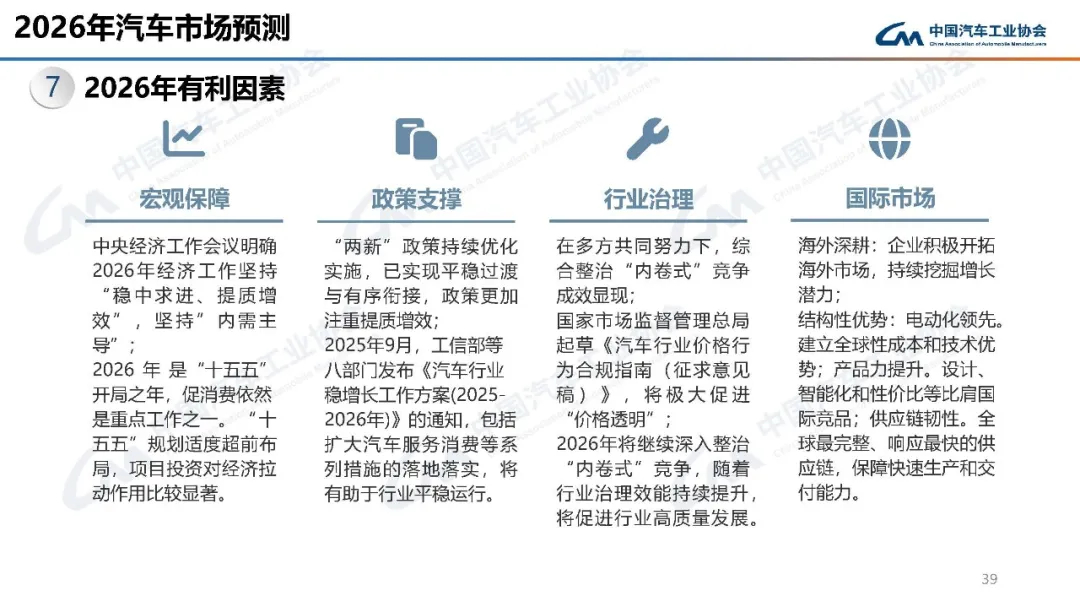 中国汽车工业协会:1,2025 年,汽车产销累计完成 3453.1 万辆和 3440 万辆,产销量再创历史新高,连续 17 年稳居全球第一。2,新动能加快释放,新能源汽车产销超 1600 万辆,国内新车销量占比超 50%,成为我国汽车市场主导力量。3,预计 2026 年中国汽车总销量 3475 万辆,同比增长 1%。