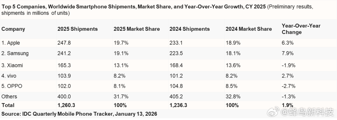 2025全球手机排行榜出炉 IDC最新报告显示,2025年第四季度全球智能手机出货量达3.363亿部,同比增长2.3%;全年出货12.6亿部,增长1.9%。苹果与三星成为增长主力,合计市场份额升至39%。苹果连续三年全球第一,iPhone 17系列在中国市场表现强劲;三星则凭借折叠屏及A系列实现自2013年来最强劲四季度增长。小米、vivo、OPPO等中国品牌份额略有下滑,面临高端转型与市场竞争压力。