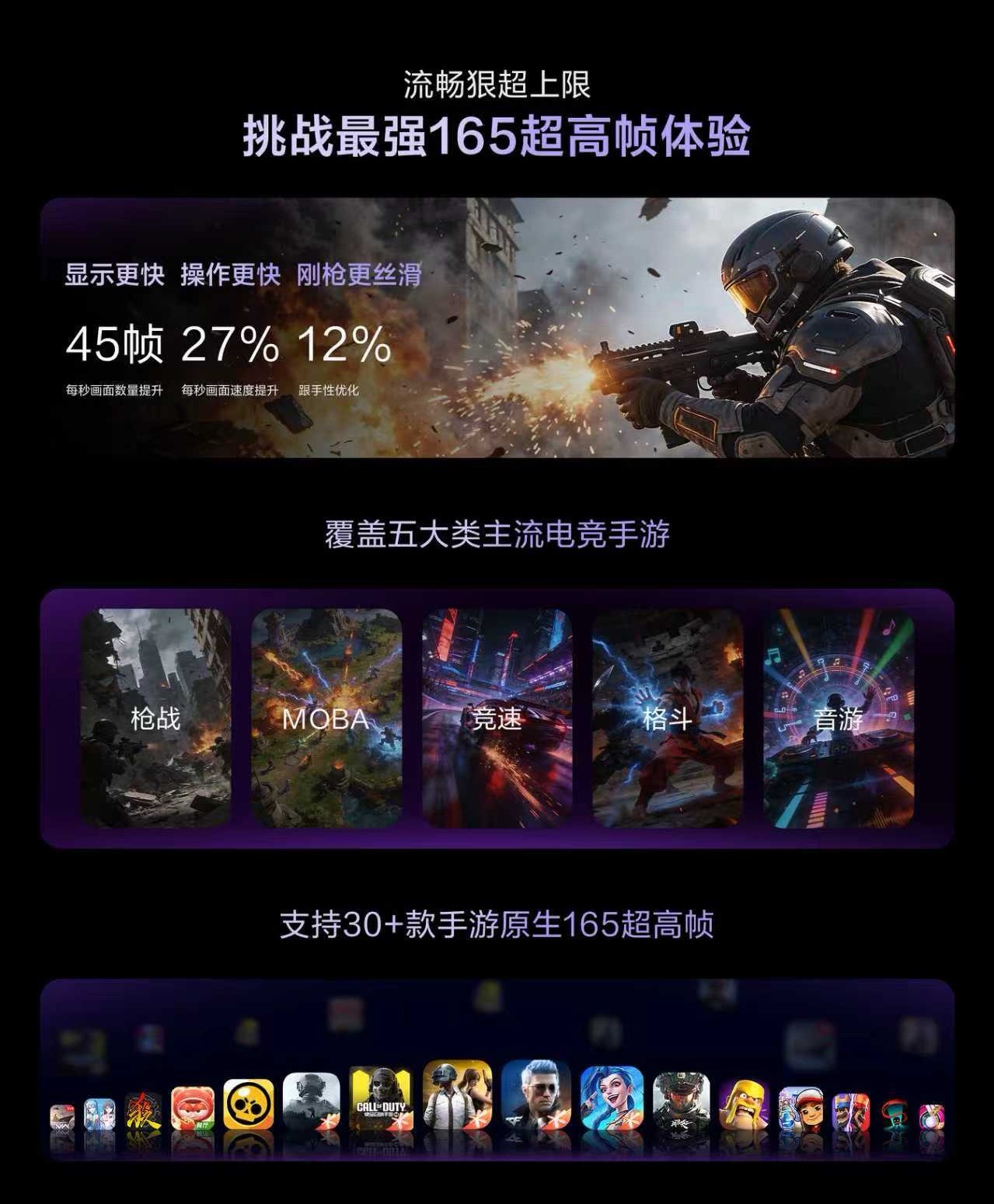 真我Neo8这次屏幕提前公布了:165Hz三星苍穹屏,与三星显示深度合作,搭载旗舰级M14发光基材,拥有四大核心优势,我们一起来看看!①通透与寿命双飞跃(M14基材加持)• 亮度表现:手动1000nit、局部峰值6500nit,全局激发1800nit,阳光模式3800nit,强光下画面通透。• 色彩与能效:103% P3超广色域,发光能效提升26%,165Hz模式功耗比传统144Hz屏幕低16%。• 耐用性:通过1500小时T95亮度衰减测试,搭配晶铠玻璃,抗摔耐刮。• 附加设计:3D超声波指纹(湿手秒解)、视觉四等边+优雅大R角,质感对齐旗舰。② 165Hz高刷生态:流畅体验降维打击• 游戏适配:支持超30款热门手游原生165帧,覆盖FPS、MOBA等五大类别,含《三角洲行动》《和平精英》等。• 优势:刷新率较45帧画面数量提升27%、速度提升12%,电竞场景开镜、索敌更丝滑。③ 操控升级:全链路重构手感• 核心配置:新一代妙感触控芯+游戏触显同步技术,降低操控延迟。• 触控采样率:单指3800Hz瞬时采样率,十指360Hz采样率,适配不同玩家操作需求。④旗舰级护眼:绿野护眼系统• 硬件基础:M14基材实现硬件级低蓝光,全亮度DC调光(SVM低至0.05),获TÜV莱茵无频闪认证。• 智能功能:AI眼疲劳守护、舒眠模式、环境色自适应,覆盖全场景及游戏护眼。