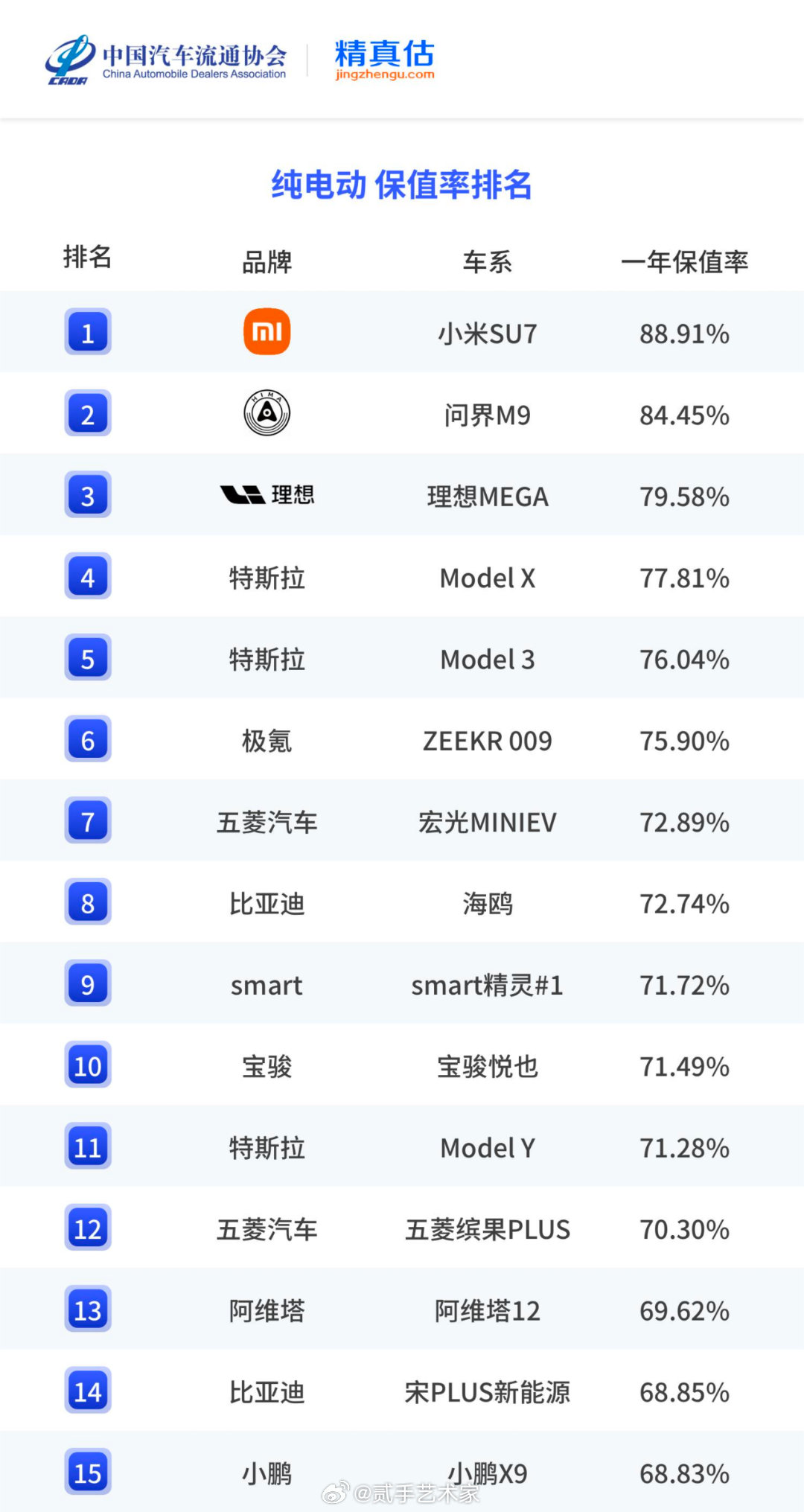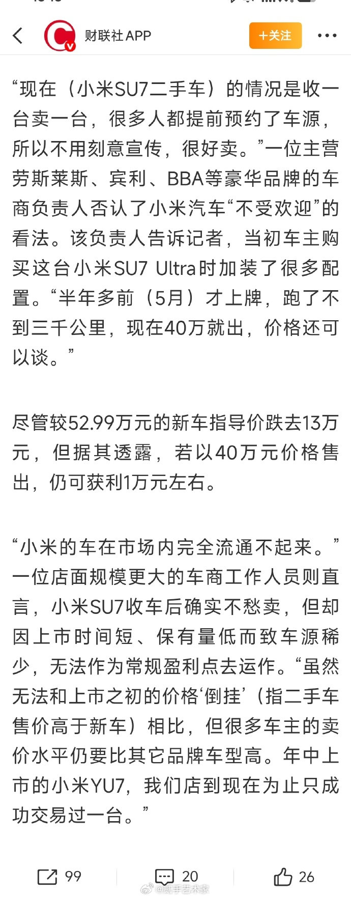 雷军回应小米二手车行情近期关于小米SU7二手行情的讨论很多。要看清真相,首先要看真实市场数据,而不是个别争议案例。根据权威二手车平台及流通协会数据显示,上市两年左右的小米SU7,其二手均价仍稳定在20.7万元左右,保值率接近89%。这一数据在同级别纯电轿车中表现突出,甚至优于部分传统热门车型。真实的市场流通情况是“来一台,卖一台”,终端热度依然很高,这直接反映了市场的真实接受度。部分二手车商惯用“唱衰”热门车型行情的手法,通过渲染“价格崩盘”来制造焦虑,目的是为低价收车创造条件。这在行业里并不是新套路,其本质是利用信息不对称影响消费者心理。判断一款车的真实价值,应参考专业平台的广泛成交数据和权威机构的保值率报告,而不是个别浮夸的,带有表演性质的营销内容。市场终会用真实的流通速度和价格给出理性答案,有些人就不要作妖了。