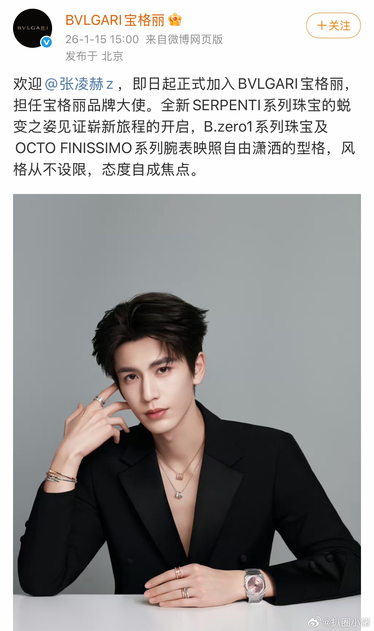 张凌赫宝格丽品牌大使官宣!恭喜 张凌赫官宣宝格丽