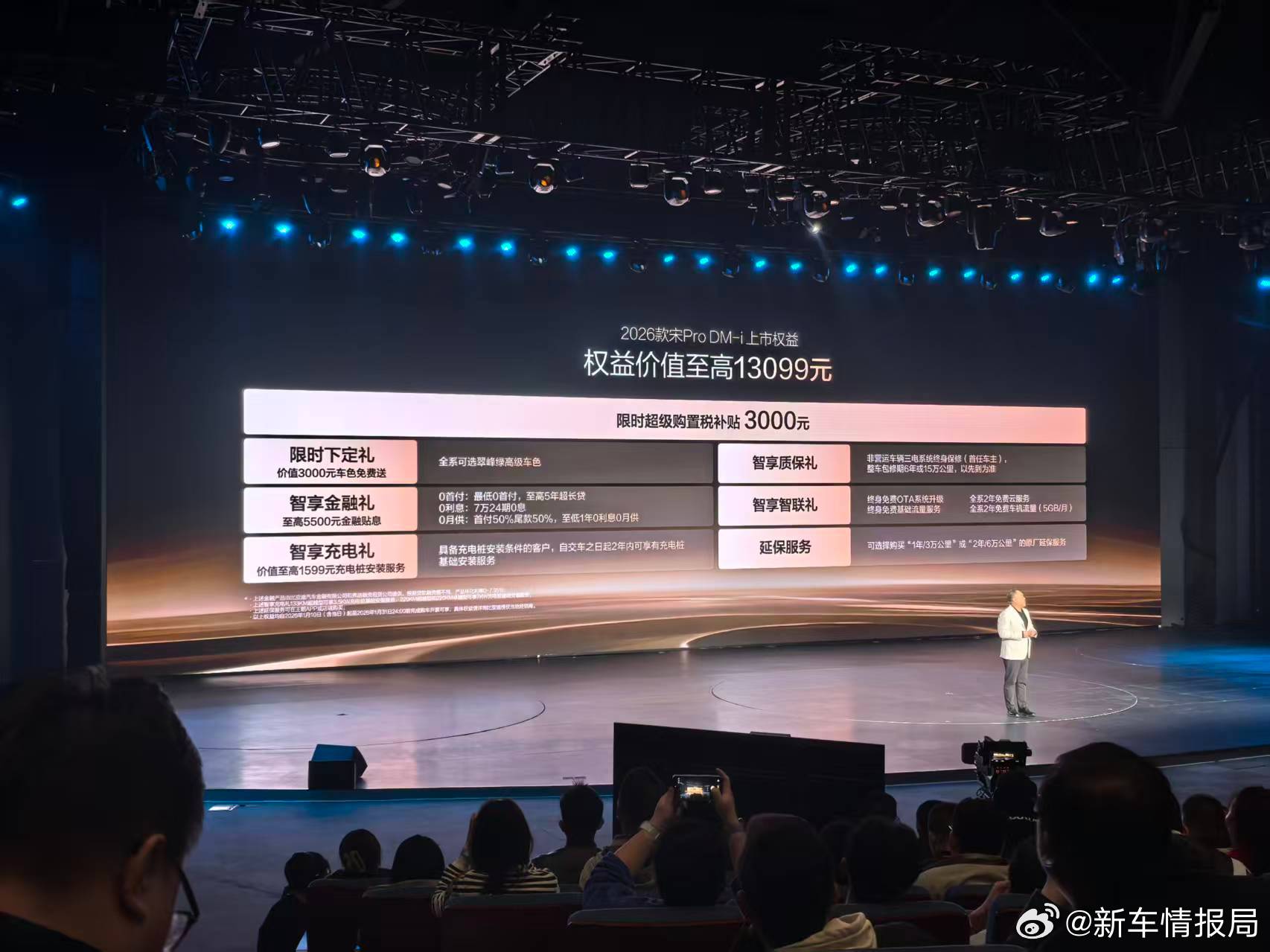 26款宋prodmi售9.98万起 1月10日,2026款比亚迪宋Pro DM-i正式上市。重点新增长续航版车型,在设计上与现售车型保持一致,主要针对配置与续航进行升级。新车限时超级优享价格覆盖9.98-11.98万元,并同步推出购车优惠政策。新车情报局新车划重点 【设计延续龙颜美学】新增星河米、翠峰绿两种车色。外观延续家族式设计语言,前脸采用封闭格栅搭配贯穿镀铬饰条,LED大灯与“宋”字标识相连。车尾贯穿式LED尾灯与隐藏排气布局简洁耐看,搭配镂空扰流板凸显运动氛围,很有现代气息。【尺寸未变空间依旧】侧身悬浮式车顶与凌厉腰线营造动感姿态,车身尺寸为4735×1860×1710mm,轴距2712mm。逼近中级SUV的尺寸,大五座布局更自如。【内饰配置实用升级】车内配备内嵌仪表+悬浮中控屏,屏幕尺寸达到15.6英寸,换装电子怀挡设计此外还加入前排座椅通风加热、一体式冷暖冰箱、全景天窗以及遮阳帘。车机搭载DiLink系统,支持AI语音控制导航、空调等功能,兼容手车互联与手表控车。具备全向泊车记录仪、手机摇一摇导航、哨兵模式等实用功能,天神之眼-C辅助驾驶系统支持高速领航与自适应巡航。【动力不变,续航提升】动力继续搭载第五代DM技术1.5L插电混动系统,发动机最大功率74kW,电机总功率120kW。本次长续航版升级重点为电池容量扩大至26.6度电,CLTC纯电续航显著增长至220公里,综合续航进一步提升至1600公里,馈电油耗保持3.2升每百公里的低水平,兼顾长续航与经济性。新车以续航升级为核心,搭配智能化配置与经典设计,进一步强化家庭用车体验。