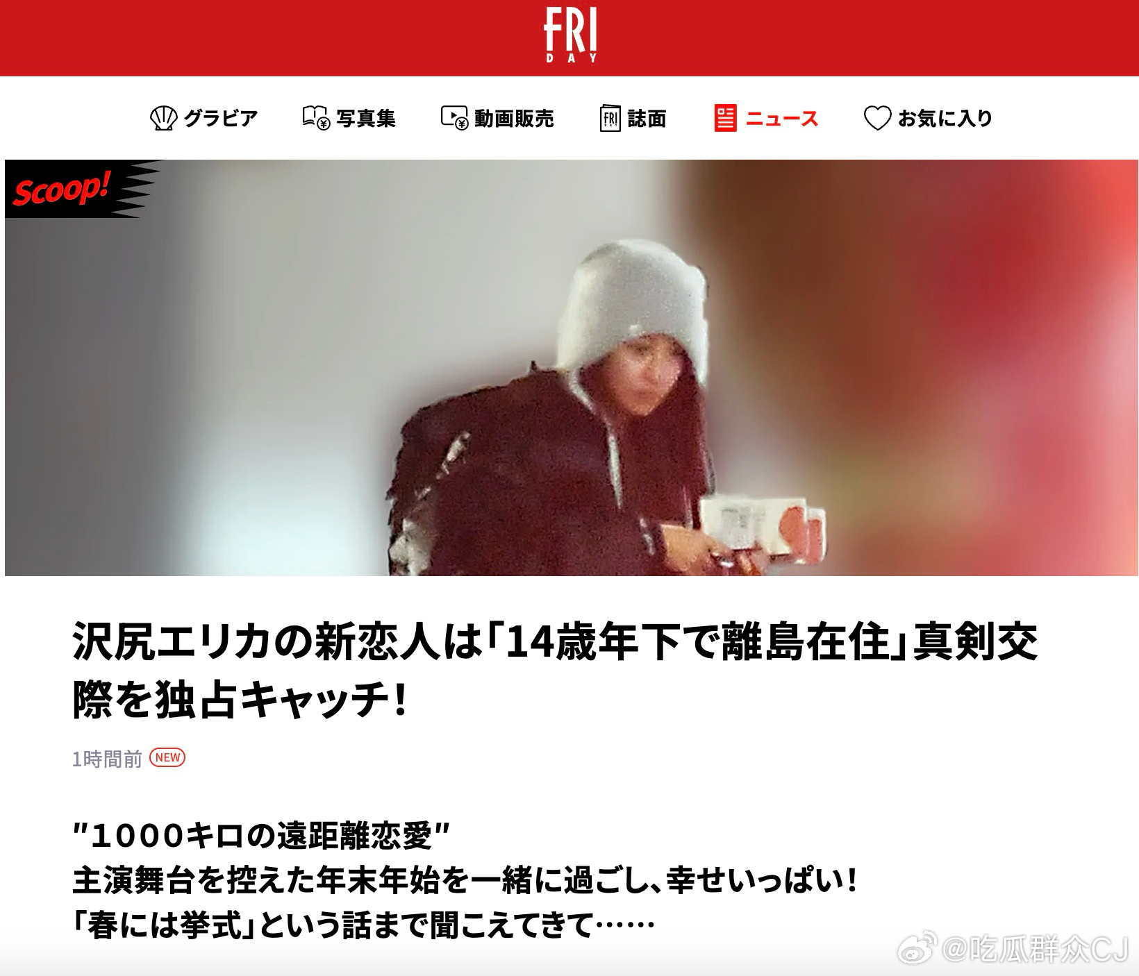 笑死,昨天Friday预告今天要爆一个日本30多岁、主演级别女演员恋上比自己小14岁的年轻男友,甚至春天准备要结婚的消息,一群人猜是黑木明纱,结果今天爆出来是泽尻英龙华……说是跨越1000公里的远距离恋爱,因为男方住在离岛上,两个人对感情很认真,一起度过了泽尻主演舞台剧前的岁末年初,而且据传有春天办婚礼的打算。