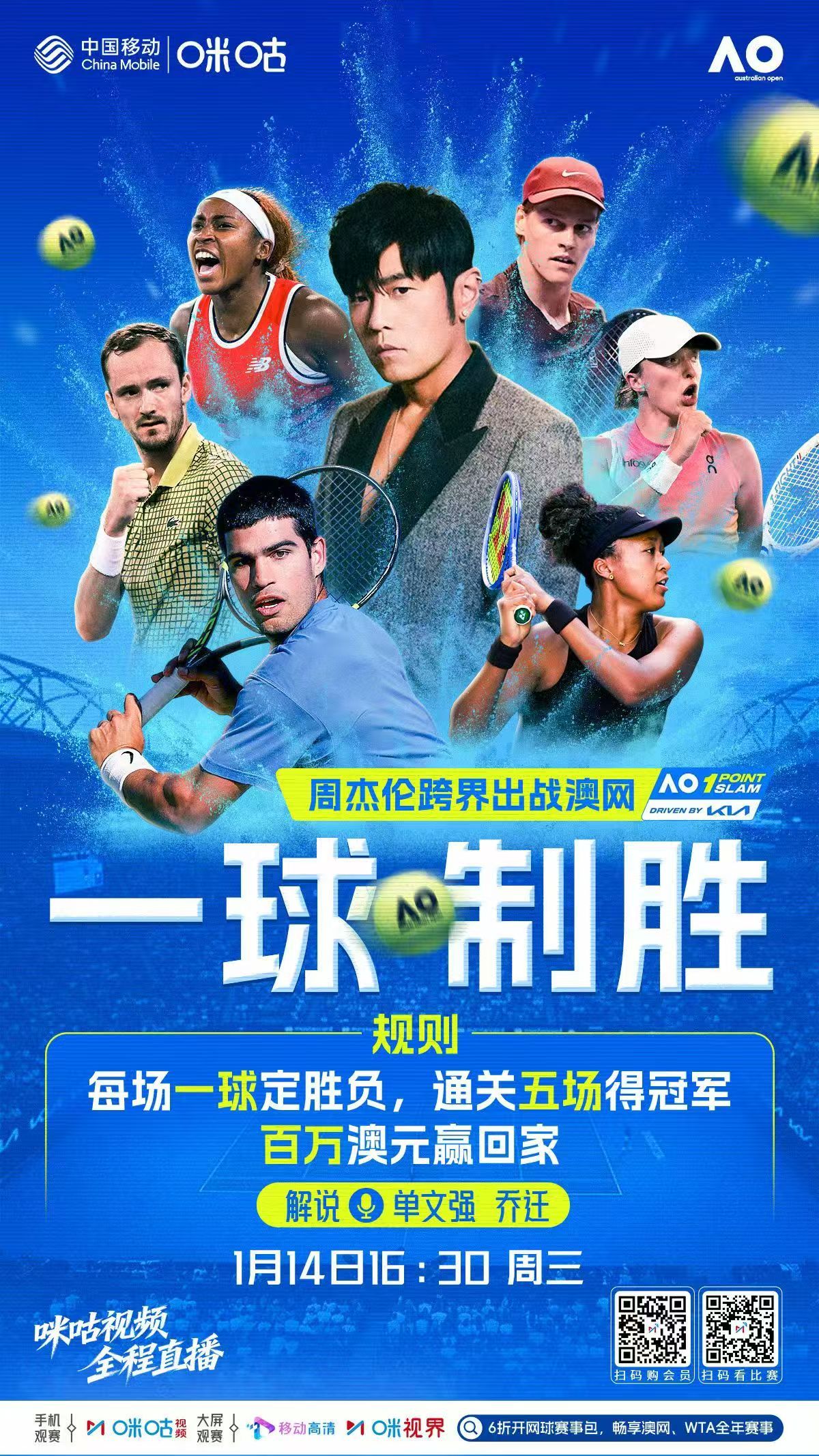 今天下午澳网将有“一球致胜”赛事,冠军独享100万澳元奖金。周杰伦要打澳网了看2026澳网上咪咕上爱奇艺体育看澳网