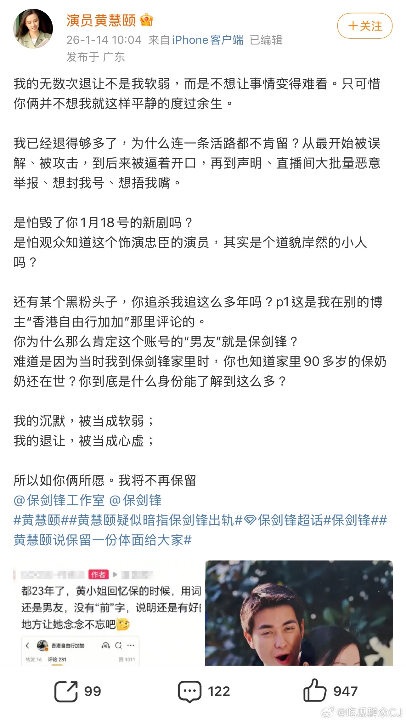 黄慧颐说保剑锋婚前出轨黄慧颐这位演员,广东人可能会比较熟悉点,就是《外来媳妇本地郎》演祝师奶的女儿婉玲,本来是和康祁耀青梅竹马的,但因为胡幸子来了之后选择和胡幸子表哥闪婚去上海,又匆忙离场的那个。戏外黄慧颐是真的去了上海,因为她当时和保剑锋在贪恋,为爱远走,保剑锋主演的《十八岁的天空》里黄慧颐也演了个角色,心理老师夏清心。这段恋情对于和他们相熟的朋友们来说不是秘密,据新闻记载,刘涛在2004年《永乐英雄儿女》佛山发布会还现场爆料,和自己演对手戏的保剑锋在和黄慧颐热恋,2005年也有保剑锋宣布将要结婚的消息,但之后又再没有动静,直到2009年保剑锋要在上海摆酒迎娶同为上戏校友的演员何珈好,媒体才从保剑锋当时开拍新剧的监制那里得知,其实他和何珈好谈了已经有两三年,跟黄慧颐早就是旧事了。黄慧颐和保剑锋分手后又回到广东发展,演过本地自制剧《一家大晒》,但整体势头远不如当年。所以去年年底网友在广州某旧书店碰到她,把照片发到网上说她境况落魄、靠卖旧书维持生活。黄慧颐对此很不高兴,因为她去旧书店是为了取景,于是自己开通账号辟谣+分享生活,却又受到围攻说她蹭热度,据说还收到了何珈好的私信辱骂,黄慧颐忍无可忍又开了直播做回应,说2006年保剑锋拿自己放在家里的香水去送人,后来看到同款香水被其他女人晒出来了,暗示保剑锋当年出轨。保剑锋工作室当然要辟谣,发声明否认,表示“网络平台中所有关于‘保剑锋先生感情存在重叠期’‘出轨’‘赠送香水’等言论均属无端揣测,恶意引导,捏造的谣言,与事实严重不符。”保剑锋自己也发了微博,暗指黄慧颐在造谣,编得还很不高级。黄慧颐忍无可忍,又在刚刚愤而开撕,直接发博说自己曾经和保剑锋是结过婚的,并不如当时和何珈好爆婚讯那篇报道所说只是恋爱而已。而且保剑锋在婚前就已经出轨了,正是因为出轨了才用求婚的方式认错,自己去上海也是因为组建了家庭为此做牺牲。黄慧颐还说保剑锋身边有人持续抹黑自己,现在自己是被逼着开口,保剑锋为了保新剧想封掉自己账号,所以她更要站出来说清楚一切。