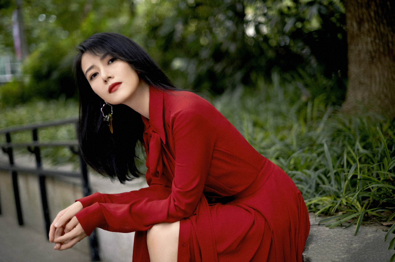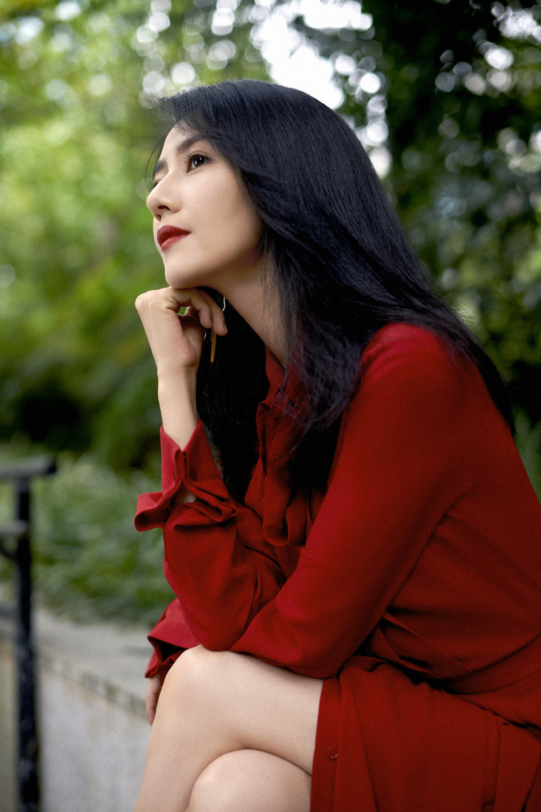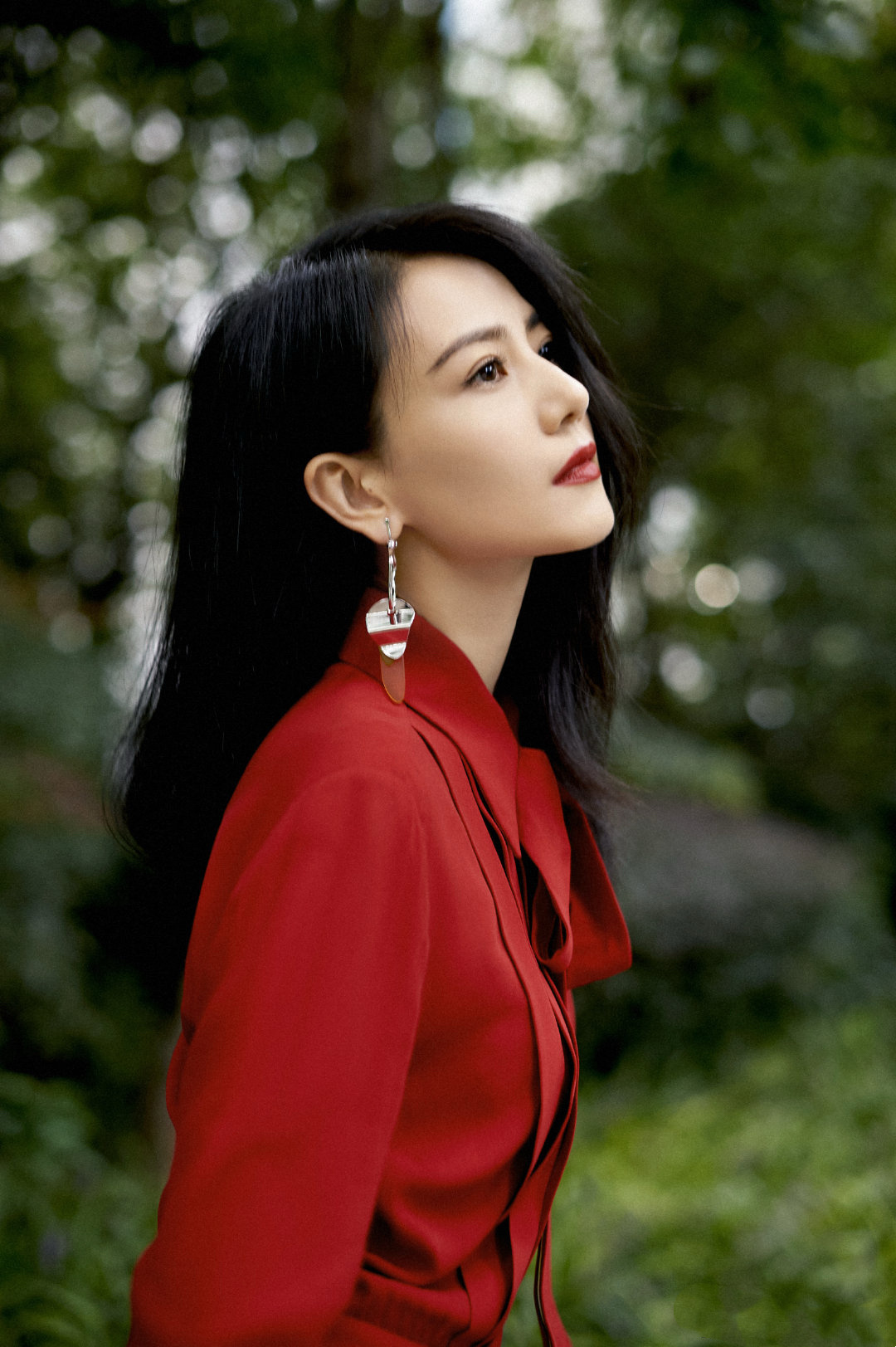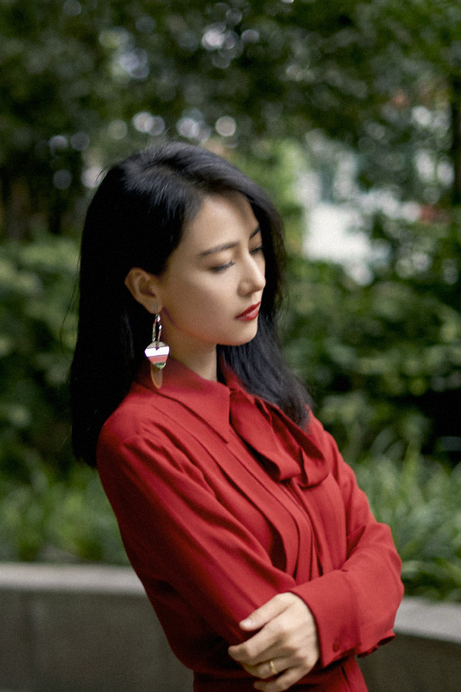这身红装造型气场拉满,正红色系衬得肌肤莹白,领口飘带增添柔美感,搭配几何耳饰更显